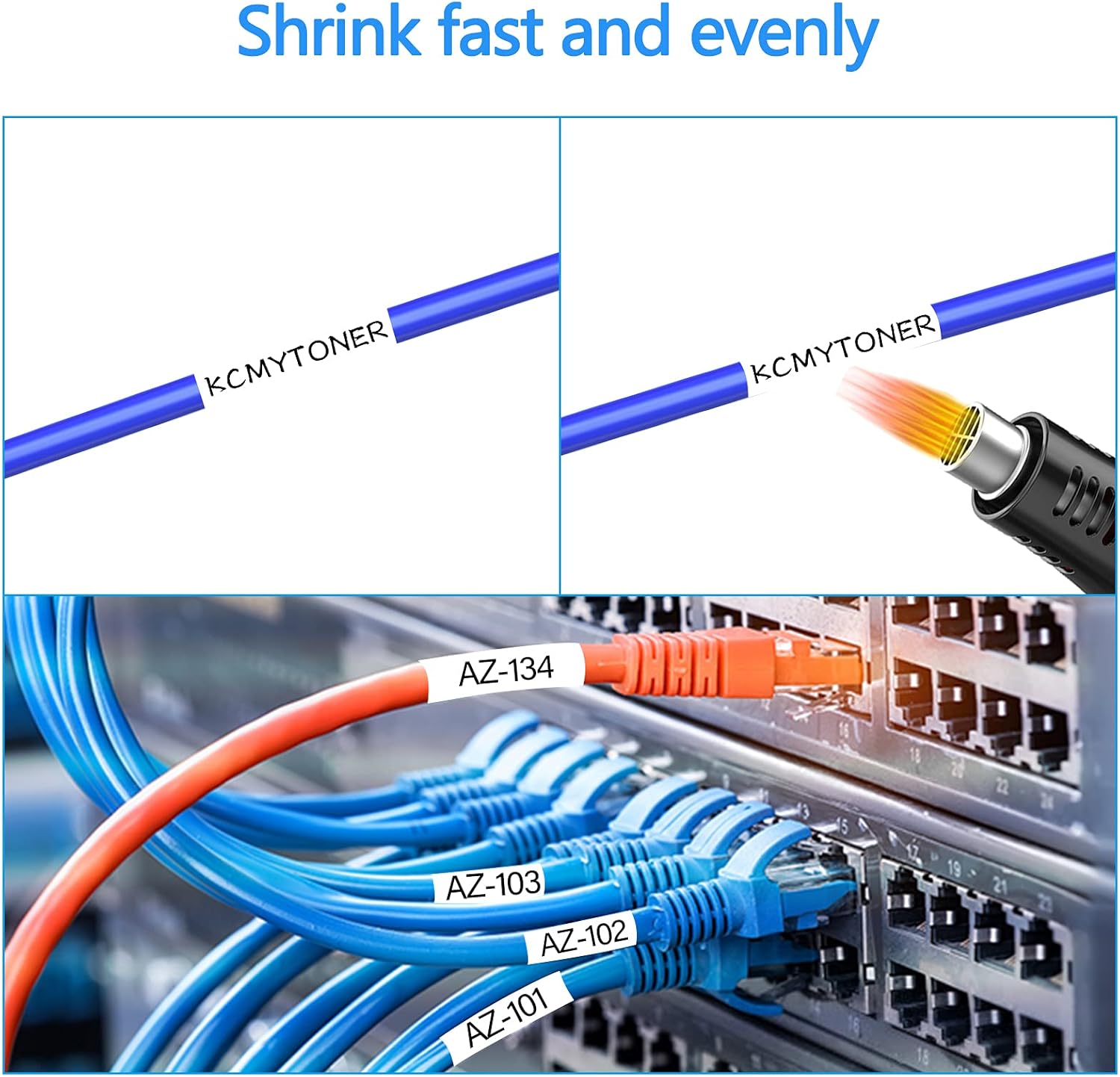 - Labeling cables more efficiently and easily: Tapes featuring shrink ratio of 2:1 which ensures a secure fit on wires and cables. You just need to slide the tube onto the wire/cable and shrink snugly to the cable with a heat gun, labels will shrink up perfectly to the wires and never curl or fall off