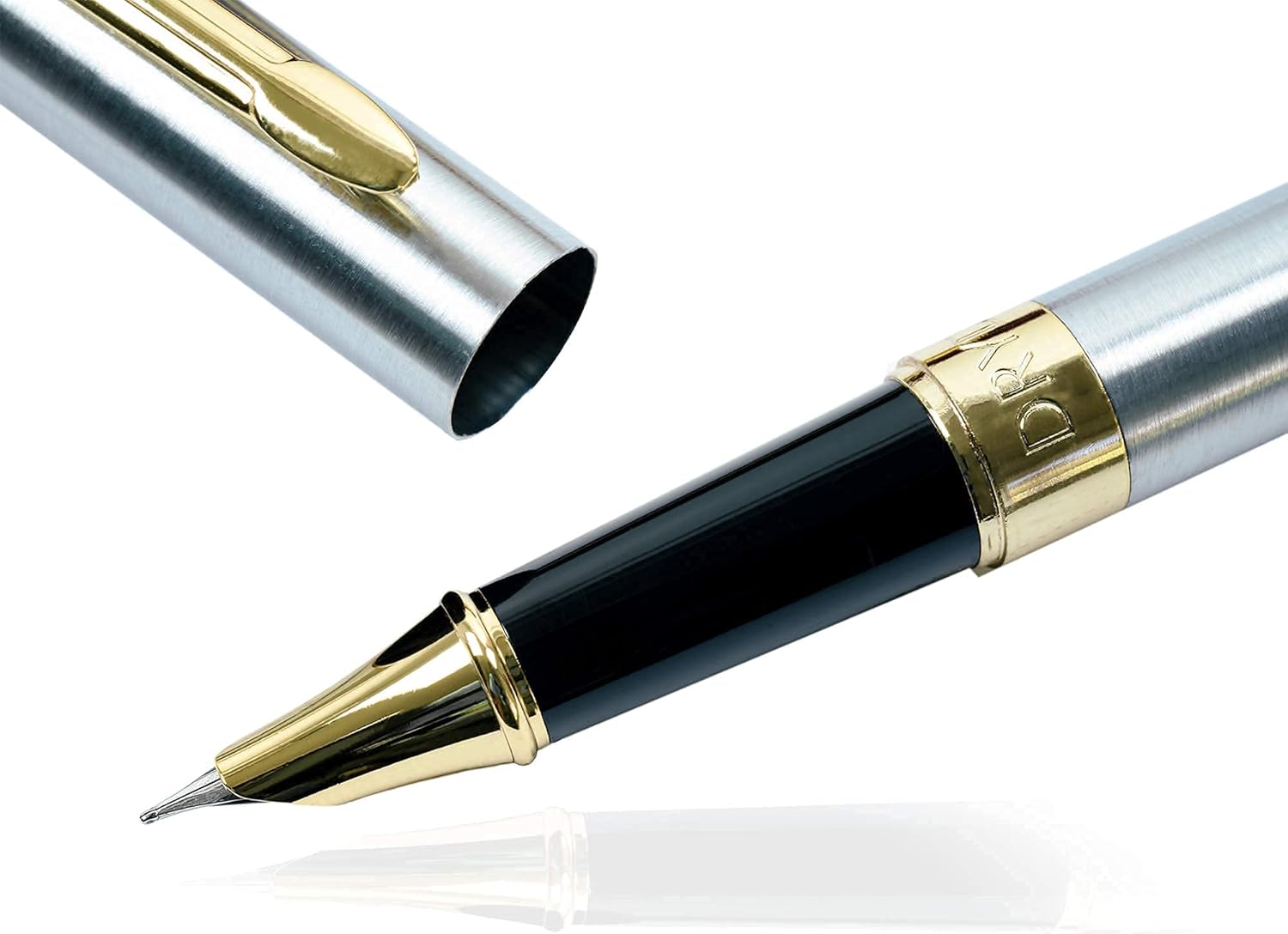 Dryden Designs Fine Nib Fountain Pen - Includes 24 Ink Cartridges - 12 Black and 12 Blue - Silver - Smooth Elegant Writing with Fine Nib and Ink Converters
