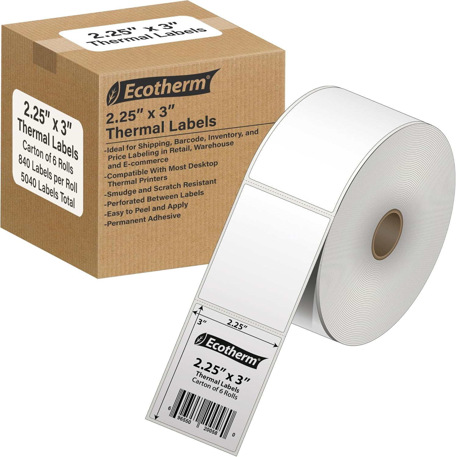 2.25" x 3" Thermal Labels | 6 Rolls | 5040 Labels | fits Zebra, Munbyn, Rollo, Godex, Arkscan, iDPRT, Offnova Thermal Label Printers and More | Blank White Adhesive Stickers by Ecotherm