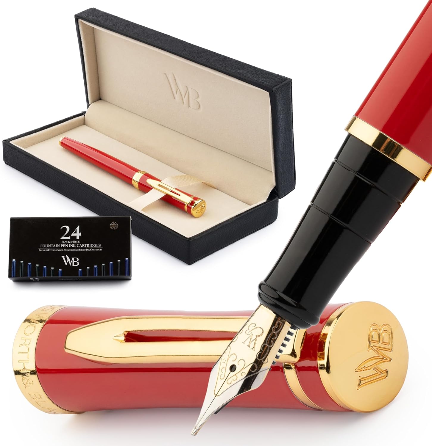 Wordsworth & Black Fountain Pen Set, Medium Nib, Includes 24 Ink Cartridges and Ink Refill Converter, Gift Case, Journaling, Calligraphy, Smooth Writing Pens [Crimson Red], Perfect for Men and Women