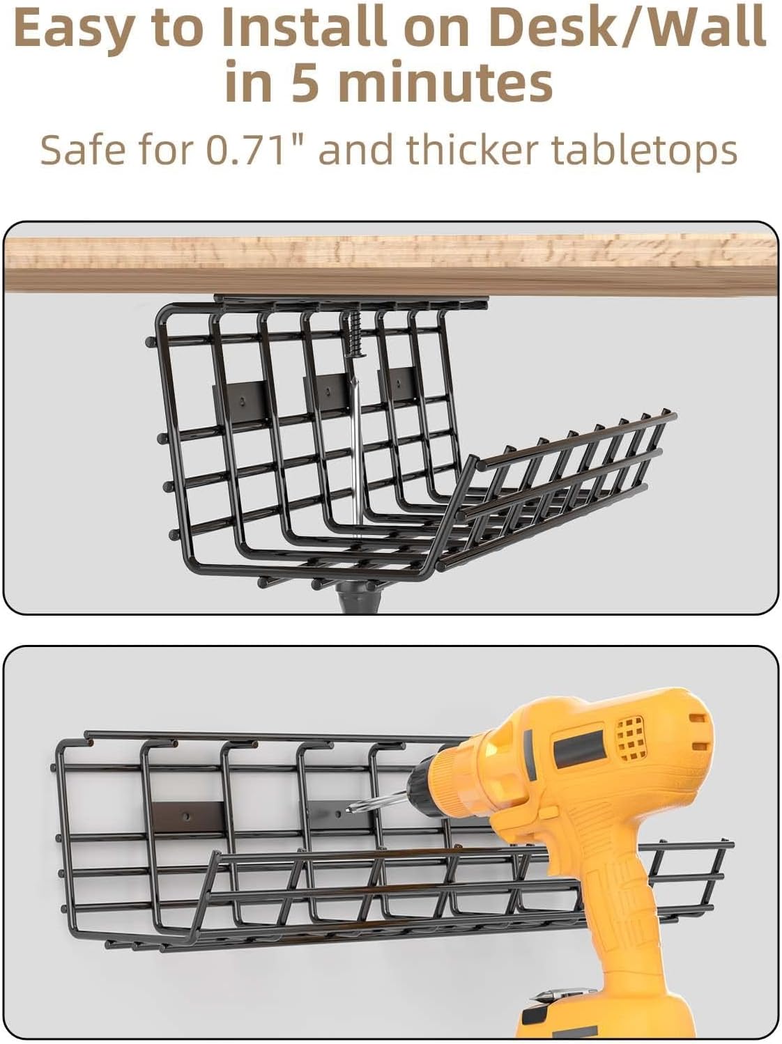 - 【Super Sturdy Desk Cable Management】Metal is stronger and more premium than plastic. This Metal and coated under desk cable management tray have good long-lasting stability and load-bearing properties. The wide opening allows you to put in or remove cables whenever needed and enables good ventilation to avoid your power supplies overheating