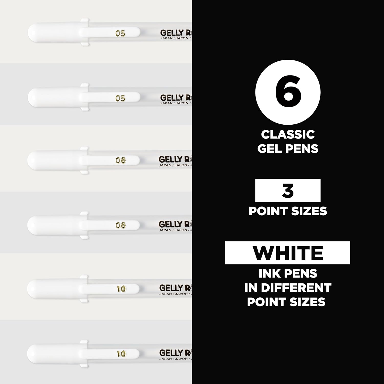 - Varied Line Sizes: Gelly Roll comes in three sizes—10 Bold for a solid bold line; 08 medium for a medium bright line; and 05 fine for a finer, lighter white line