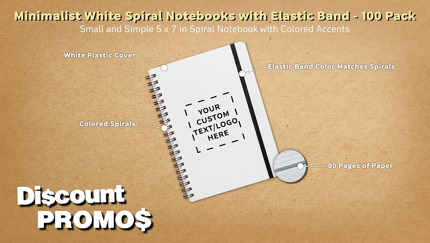 100 White Spiral Notebooks with Elastic Band Pack - Customizable Text, Logo - 80 lined pages, Recycled - Black