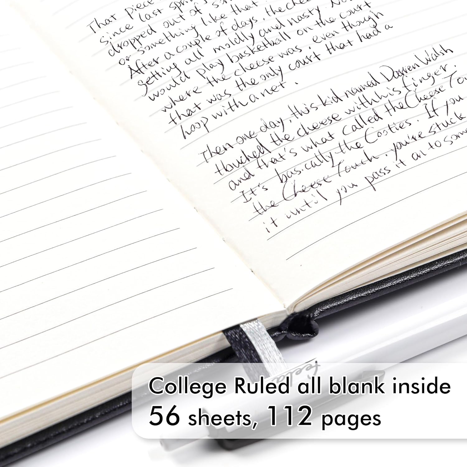 - These college ruled notebooks are all blank inside with 112 lined pages (56 sheets), which would be convenient for daily usage. The hard cover journal has a water resistant faux leather cover, round corners and bookmarks, which is designed to lay and open flat. There’s a “date/page” column on the top of every page. You can use it as a reminder to let you remember those important dates and find the page you want in a very short time.