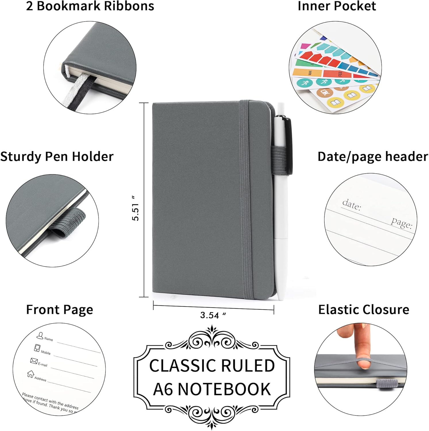 - Feela 6 Pack College Ruled Gray Notebooks contains 6 college ruled sturdy cover notebooks and 6 Black Retractable Pens. Each of the notebooks measures 3.5” x 5.5”, which is perfect to carry and easily held by young girls and boys. These black cute pens are customized to be placed in the pen holder, which is pretty convenient.