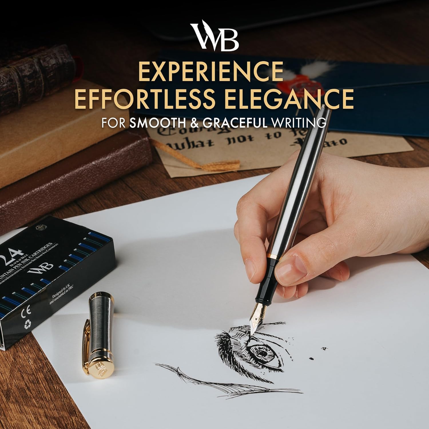 Wordsworth & Black Fountain Pen Set, 18K Gilded Extra Fine Nib, Includes 24 Pack Ink Cartridges, Ink Refill Converter & Gift Box, Gold Finish, Calligraphy, [Silver Gold], Perfect for Men & Women