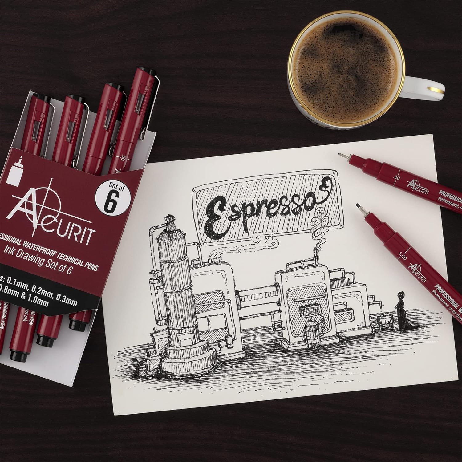 Waterproof Technical Pens - Professional Waterproof Technical Pen, Rich Blank Ink, Acid-Free, Light Fast, for Sketching, Drawing, CAlligraphy, & More! - [6-Pack - Assorted Sizes]