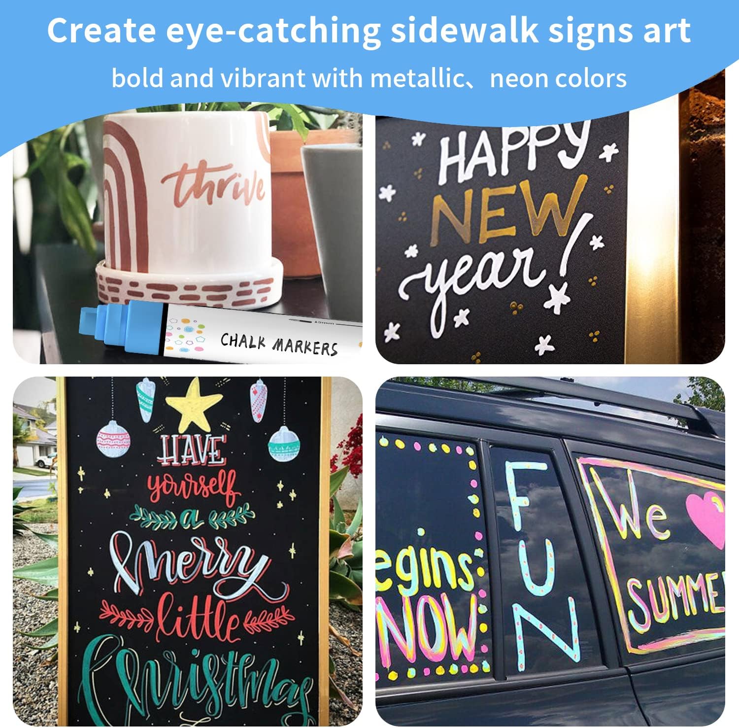 - Eleven Colors in a 12-Pack: This set includes a vibrant selection of neon colors—2 white, 1 red, 1 orange, 1 yellow, 1 green, 1 blue, 1 purple, and 1 pink—along with 3 metallic shades: gold, silver, and rose gold. These car window paint markers washable work great on car windows, glass, mirrors, chalkboards, craft paper, hands, chalk lettering, and stencils
