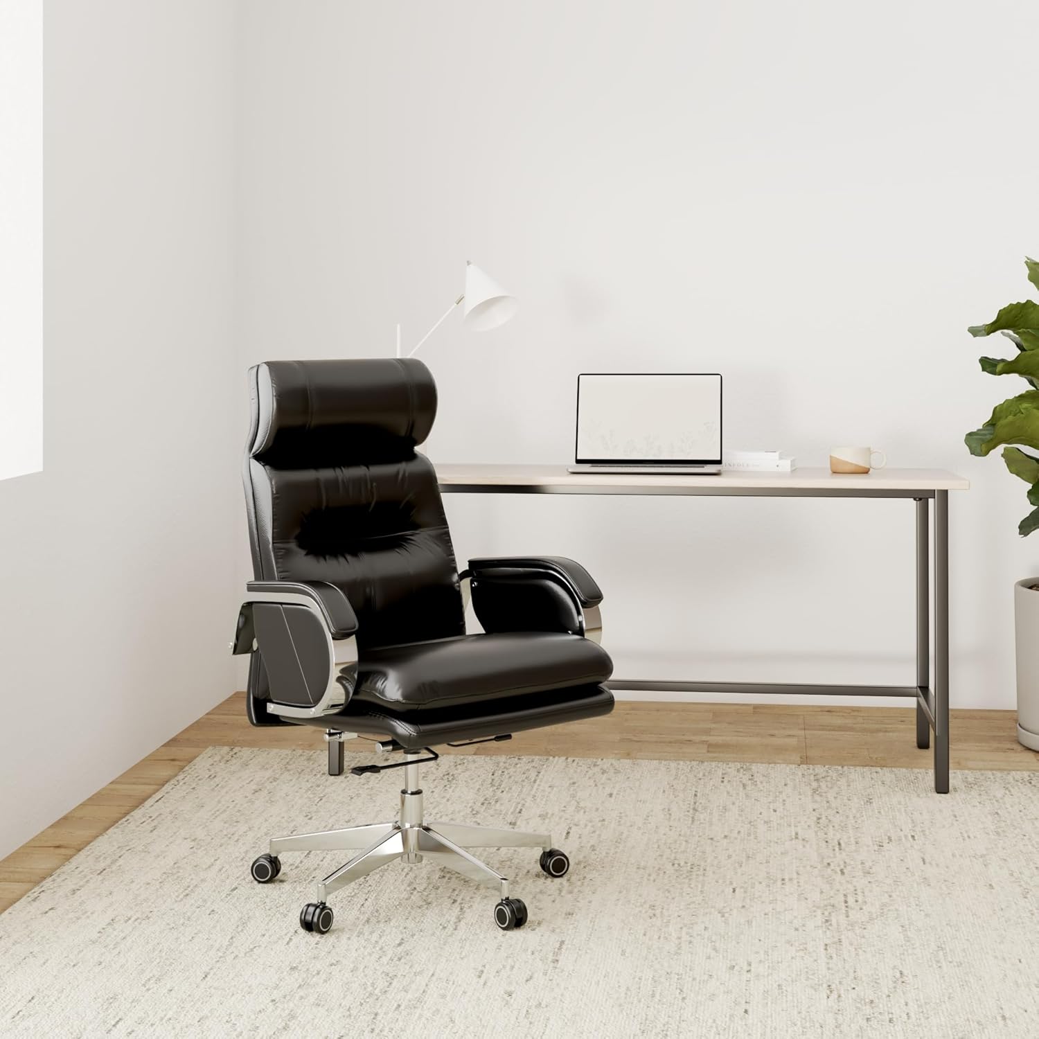Genuine Leather Modern Executive Chair High-Back Support 90 to 150 Degrees Tilt and Upholstered Home Desk Chair with Base 360LB Capacity Swivel Computer Office Chair (Black)