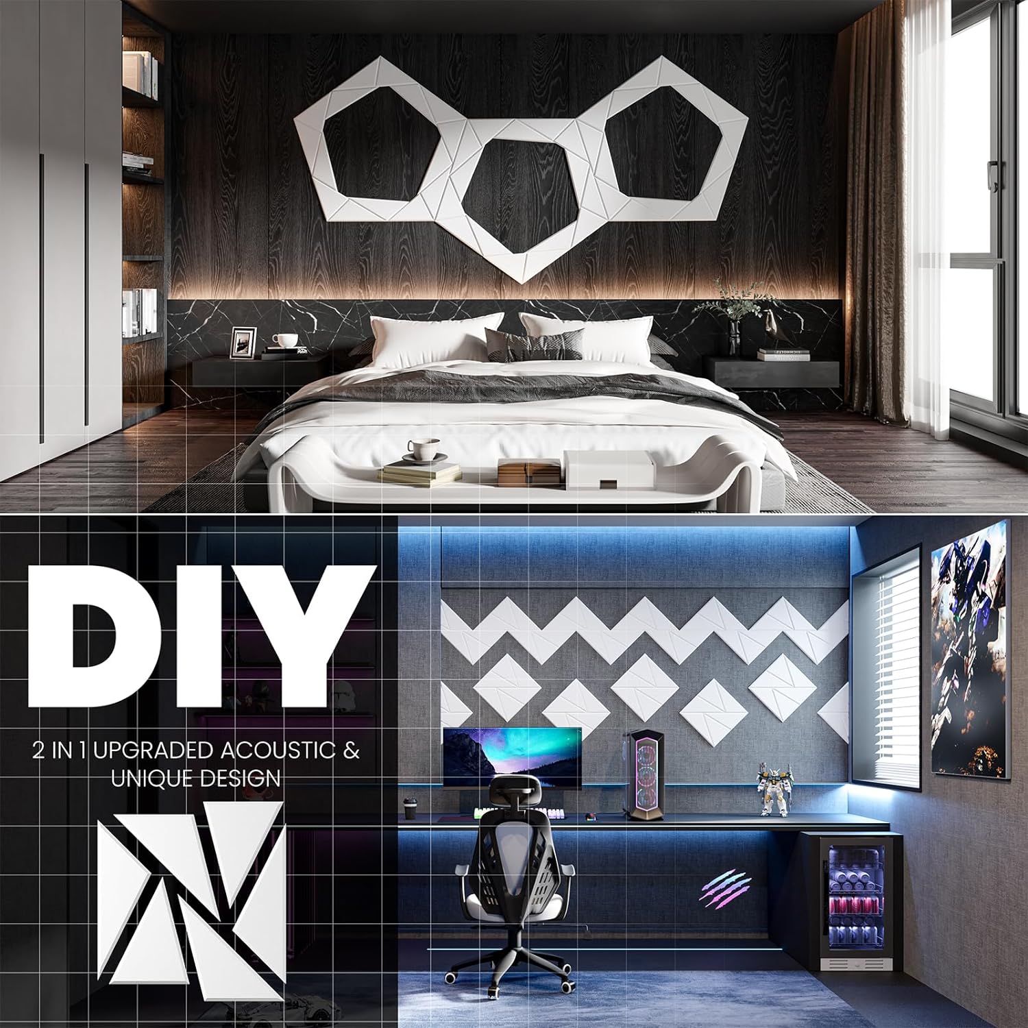 - 👍【Perfect for wall decoration】Be different from other acoustic panels,We have not only upgraded their acoustic performance,but aslo their appearance.Adopt beveled edge and multi-line design.They can be DIY into pinwheel patterns and multi-ring patterns.They absorb unnecessary sound while playing a good role in decorating the wall.Perfect for professional studios, video blogger,game room, podcasting, school,home theaters,offices,etc.