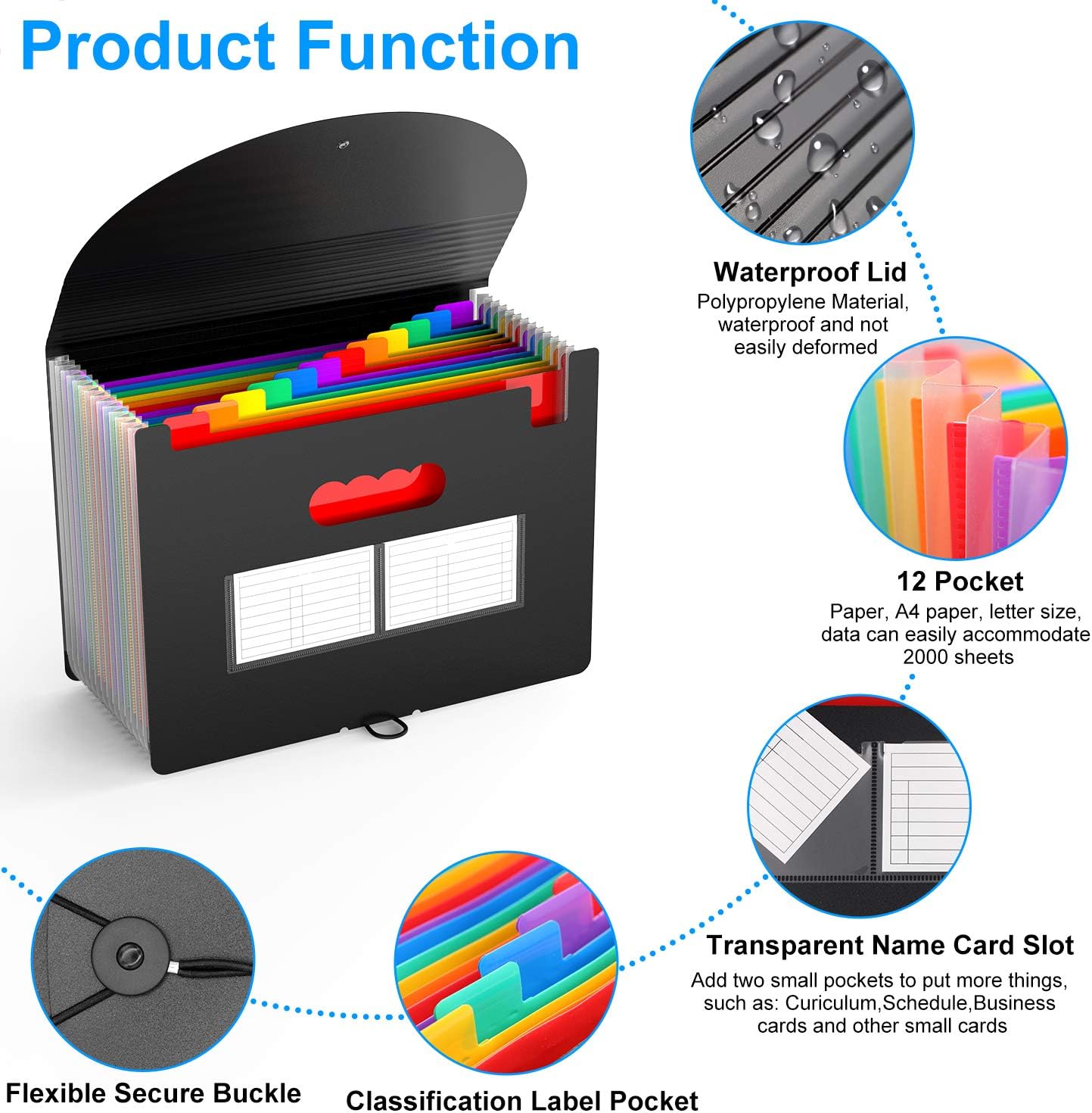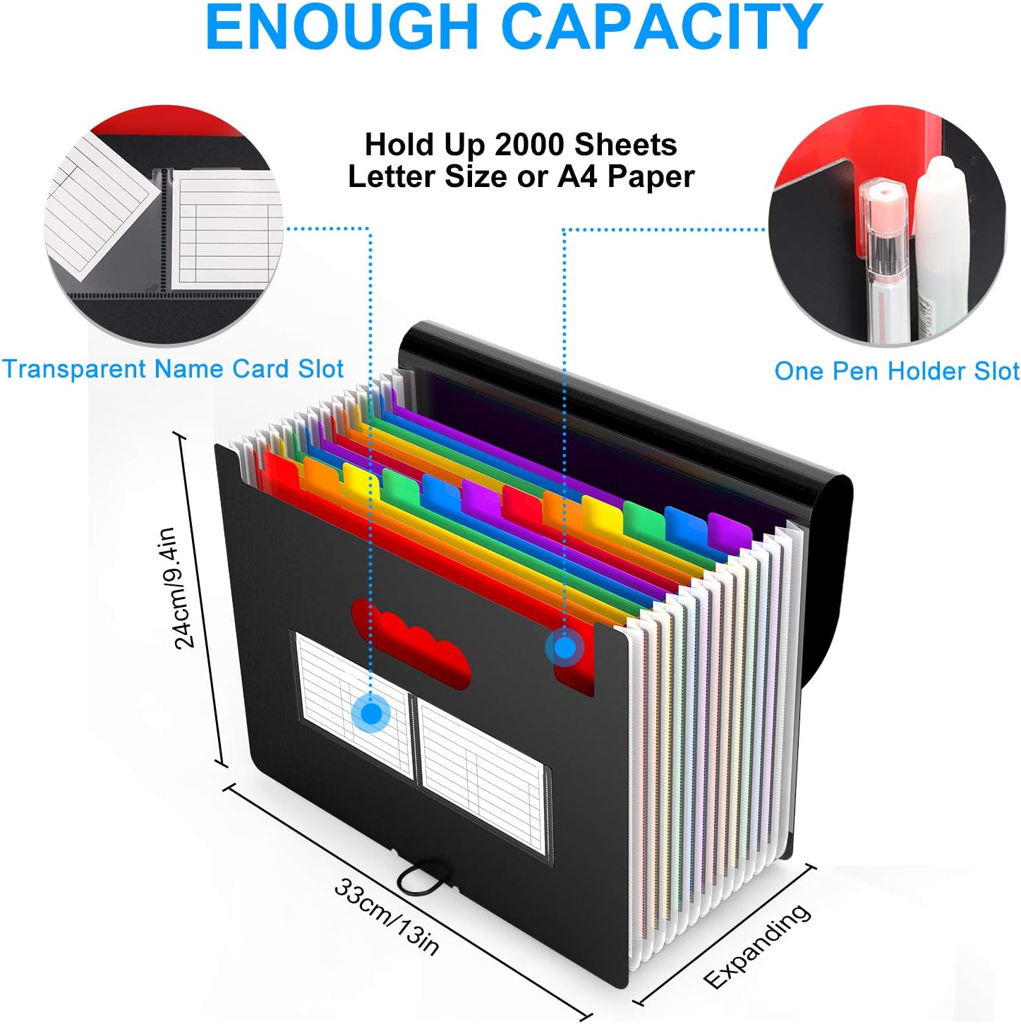 - 📂【EXPANDABLE & HIGH CAPACITY】-The file organizer keeps each slot's papers separated and organized in a good manner. 12 pockets expandable file folder. Product Size: Length: 13” High: 9.25'', width:1.06"-12". Expandable property gives it a possibility to hold approximately 2000 A4 sheets.