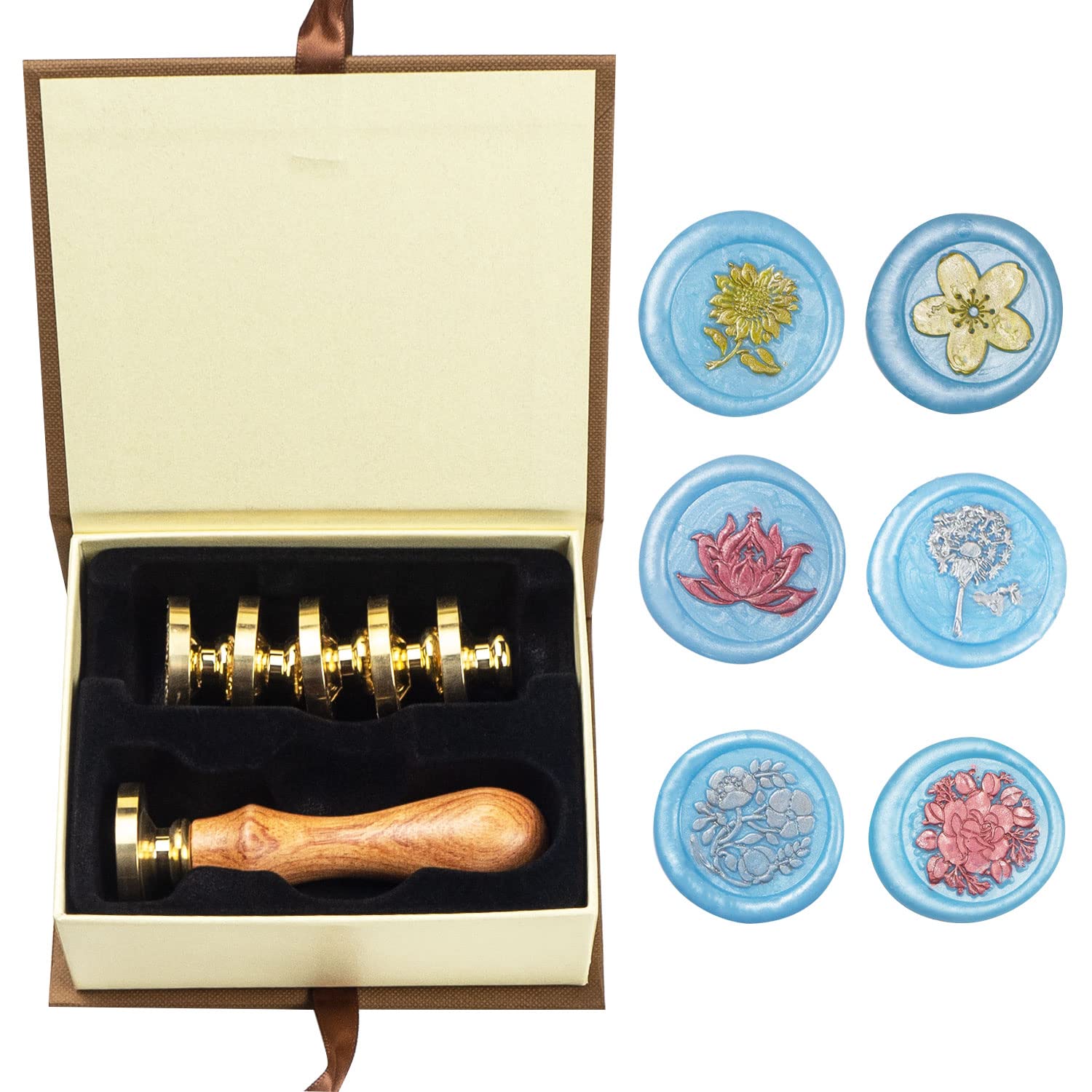 Flower Wax Seal Stamp Set with 6 PCS Removable Brass Heads and 1 Wooden Handle - Sunflower, Three Flowers, Lotus, Dandelion Sealing Wax Stamp for Cards & Invitations