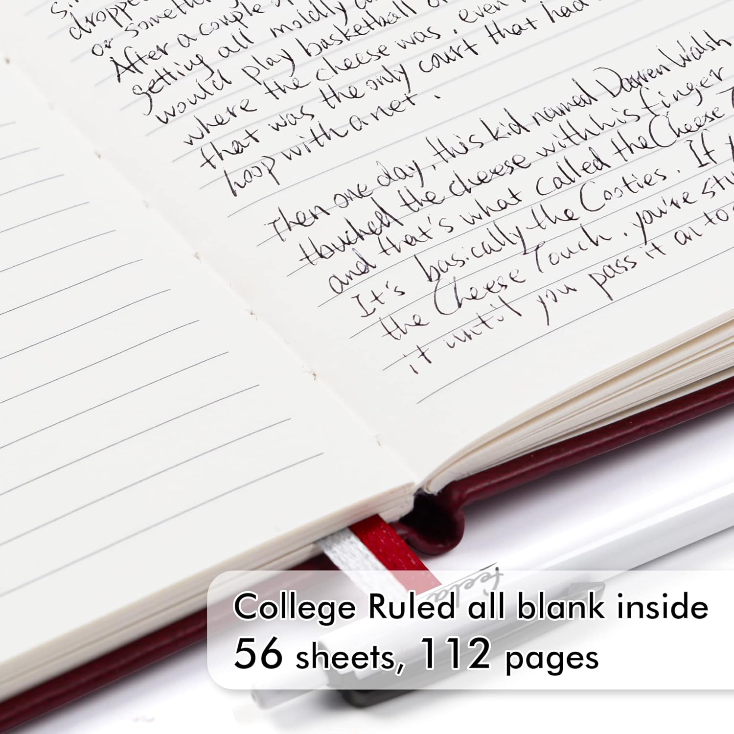 - These college ruled notebooks are all blank inside with 112 lined pages (56 sheets), which would be convenient for daily usage. The hard cover journal has a water-resistant faux leather cover, round corners and bookmarks, which is designed to lay and open flat. There’s a “date/page” column on the top of every page. You can use it as a reminder to let you remember those important dates and find the page you want in a very short time.