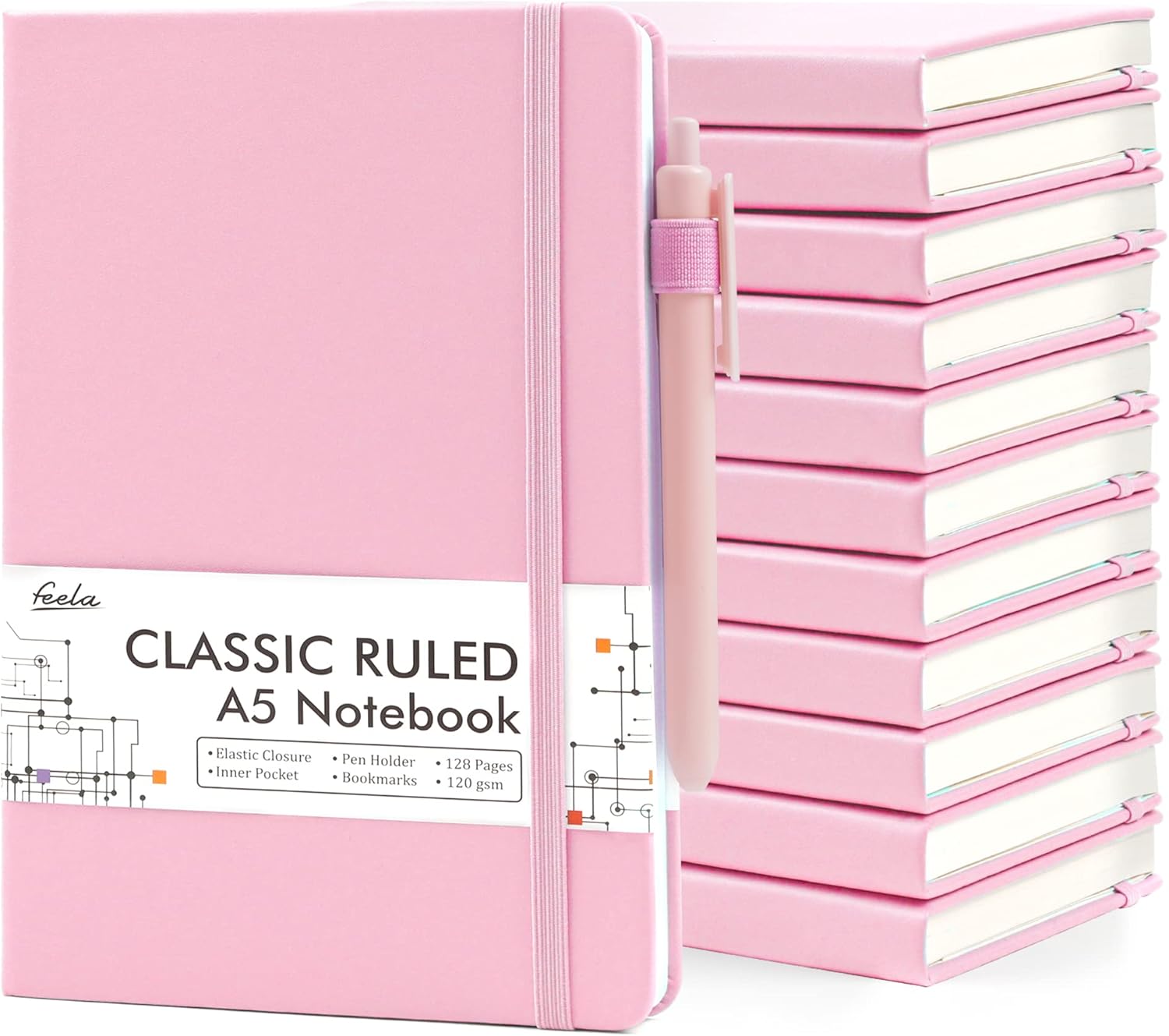 - Feela 12 Pack Classic Ruled Notebooks contains 12 rose pink ruled sturdy cover notebooks and 12 Black Retractable Pens. Each of the notebooks measures 8.3” x 5.1”, which is perfect to carry and easily held by young girls and boys. These black cute pens are customized to be placed in the pen holder, which is pretty convenient.