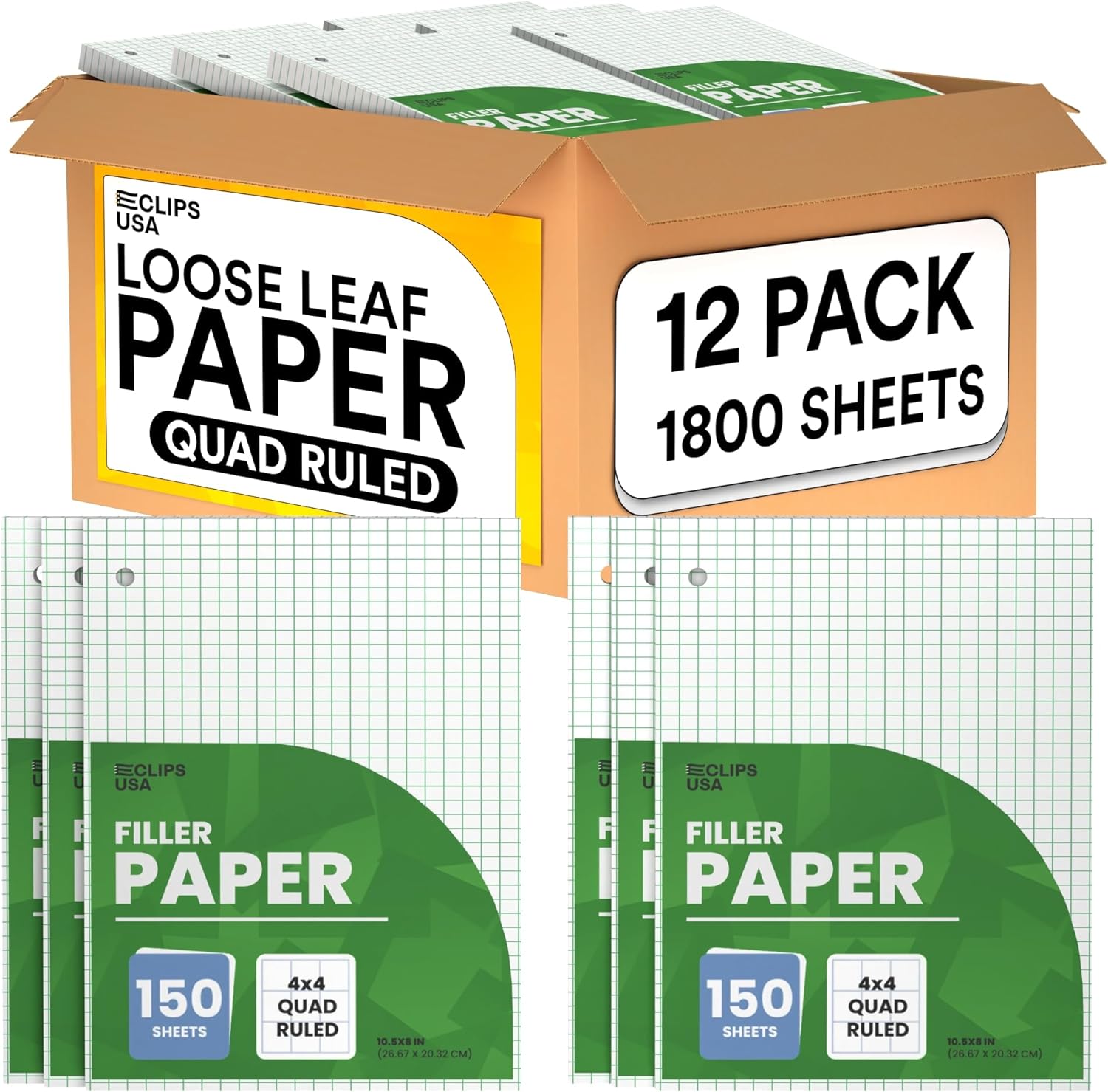 Graph Paper, Loose Leaf Graph Paper, 4 x 4 An Inch Quad Ruled Graph Paper, 10.5” x 8” Graphing Paper, 56 gsm, 150 Per Pack,1800 Sheets (12 Pack)