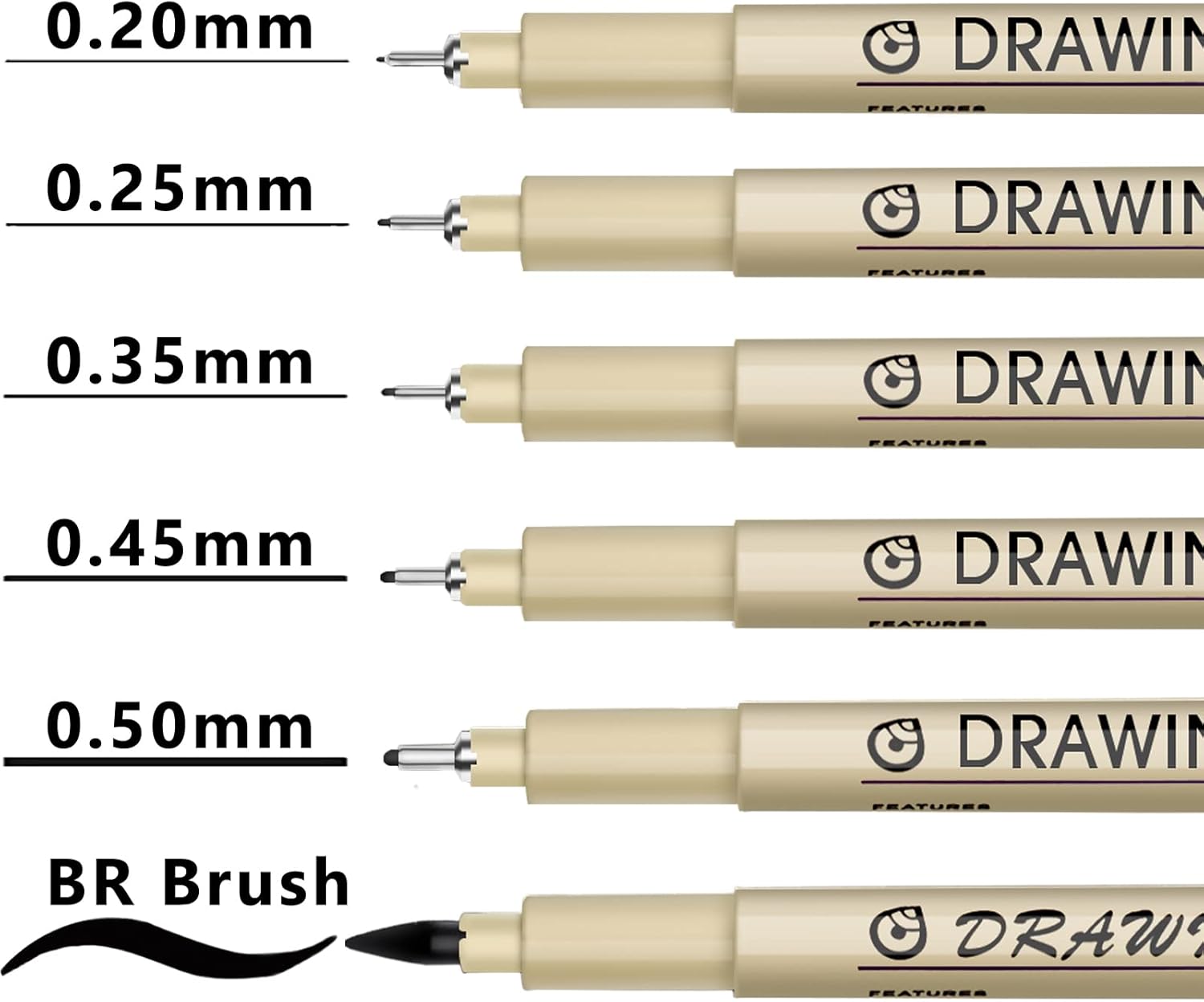 - ❤6 Black Art Drawing Pens: The professional micro pen kit contains assorted types of pen tips from 0.20mm to 0.50mm, plus a brush tip. No Bleed, No Smear and Waterproof. Perfect for drawing and writing. One set of pens for all your art creation needs. Whether you are an artist or a beginner, you can easily use it. Line Width & Cap Size: 0.2mm (005), 0.25mm (01), 0.35mm (03), 0.45mm (05), 0.50mm (08), Brush (BR)