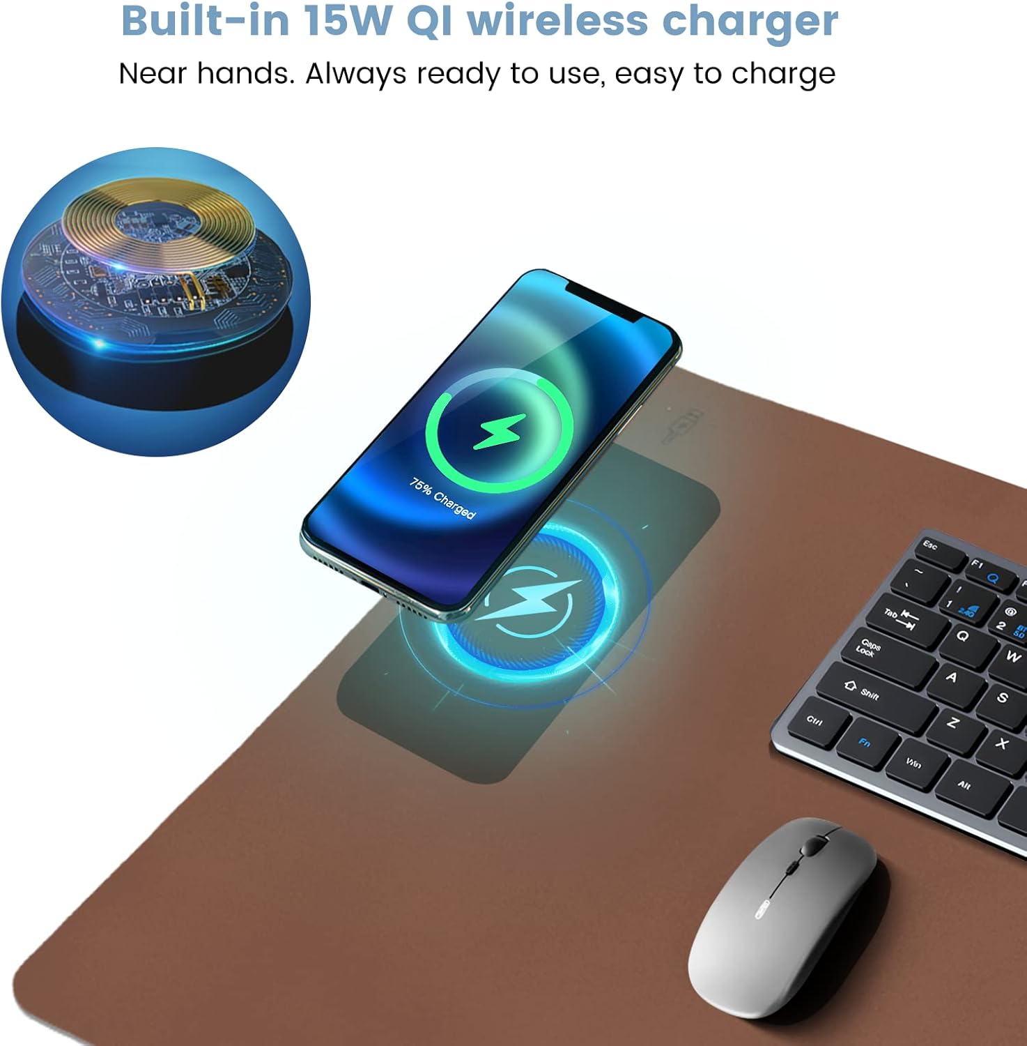 Desk Mat Wireless Charging Mouse Pad Large 32x16 Journey Desk Pad Mat with Wireless Charger Waterproof Leather Computer Mat with Phone Charger Mousepad Non-Slip for Keyboard and Mouse