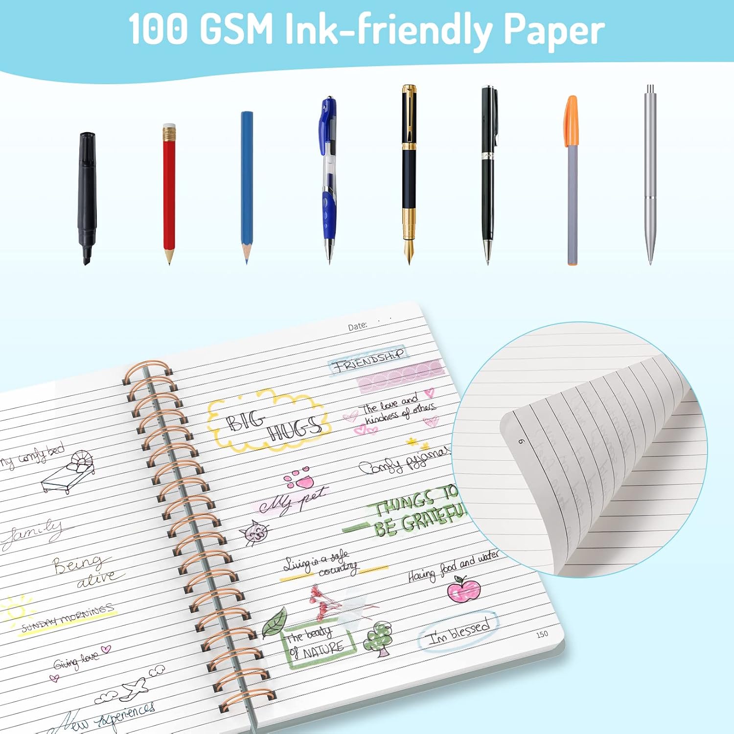- 100 GSM Ink-friendly Paper: The pages are very thick which avoids ink bleeding through and ghosting. Suitable for most pen types, such as ballpoint pens, fountain pens, gel pens, pencils and so on. Allowing you to write on both sides of every page to maximize your usable space.
