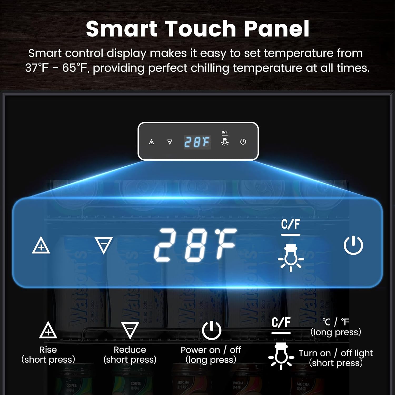 - ăTemperature Memory MasteryăOur sleek beverage cooler sports an intuitive touch display, making it a breeze to dial in your ideal temperature. If the power suddenly cuts out, no worries â it snaps right back to your set temp. This nifty trick stops cans from going bad when the heat rises and keeps every bottle and can at a uniform humidity level. What's more, the fridge defrosts on its own, so you can sip your beverages without a hitch and enjoy pure refreshment