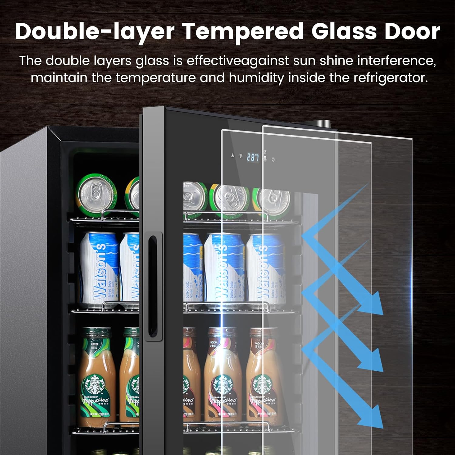 - ăPremium Double Tempered Glass DoorăOur state-of-the-art beverage cooler refrigerator is equipped with a double tempered glass door that comes with a reliable locking mechanism. This door not only offers enhanced insulation capabilities but also serves as a stylish and practical feature. The transparent glass panel allows you to effortlessly showcase and keep an eye on your prized collection of wine and beer, all while the refrigerator efficiently sustains the perfect internal temperature, ensuring your beverages are stored in optimal conditions