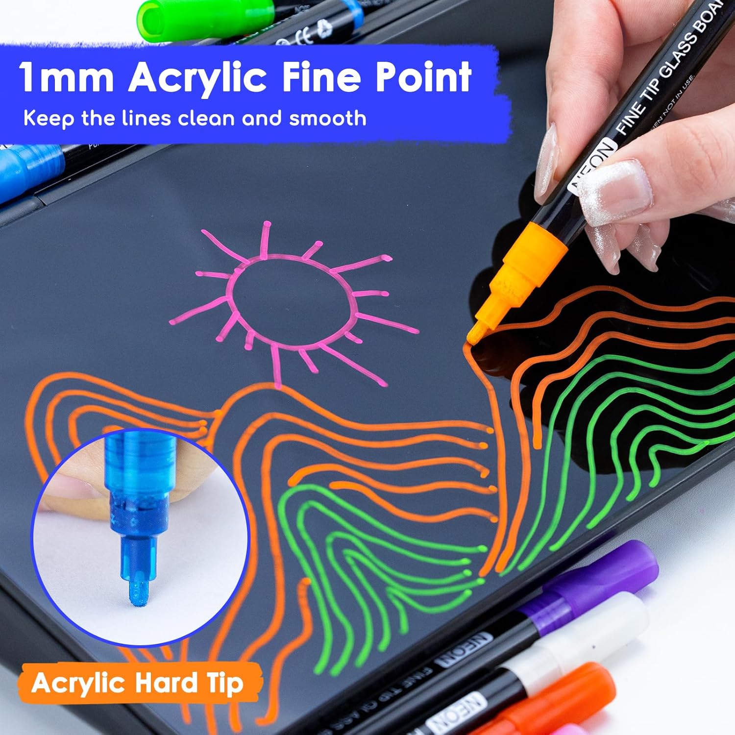 - Unleash your creativity on a variety of surfaces: The Maxtek neon fine tip markers set includes 7 neon colors plus 2 white neon markers, widely used to decorate wedding signs, windows, calendar board, milestone boards, menus, LED boards, car mirrors, wine glasses or any Non-Porous surface