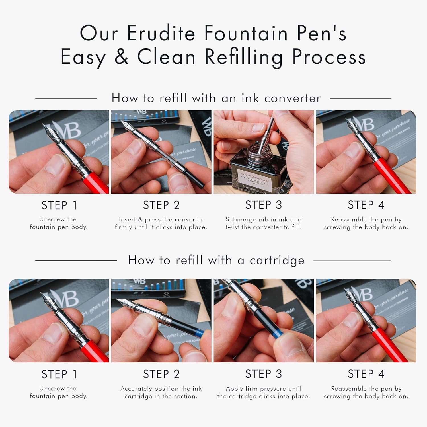 - ✒️Discover The All-inclusive Refillable Fountain Pen Set - Includes luxurious fountain pen, ink converter, 24 Pack Ink Cartridges, and a Gift Pouch - ready to be gifted. Each calligraphy ink and fountain pen ink cartridges comes in a plastic re-closable case and will last you at least 2 weeks of regular use. With every order is a complete instruction booklet for your Wordsworth and Black Pen Set. All the information you'll need to get started using and enjoying your luxurious writing tool!