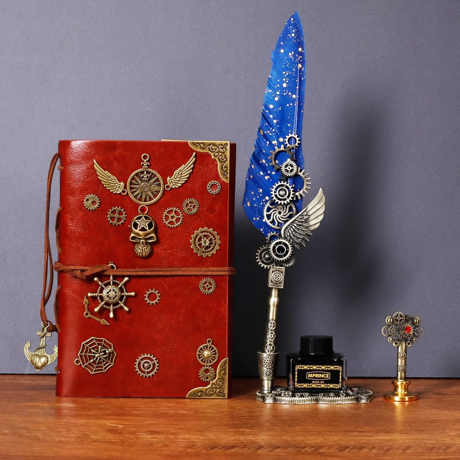 - 【Quill Pen Ink Set Included】: 1* Quill Pen, 1* Notebook, 1* Ink(Black), 1* Seal Stamp, 1* Pen Holder, 5* Stainless Steel Nibs Of Different Sizes, 1* Wax Beads, 1* White Wax, 1* Spoon, 1* Cup, 1*1 Envelope Opening Tool, 1* Envelope and writing paper, 1*Exquisite Gift Box.The unique and beautiful punk mechanical gear design is a beautiful landscape no matter it is placed on the desk, coffee table or computer desk.