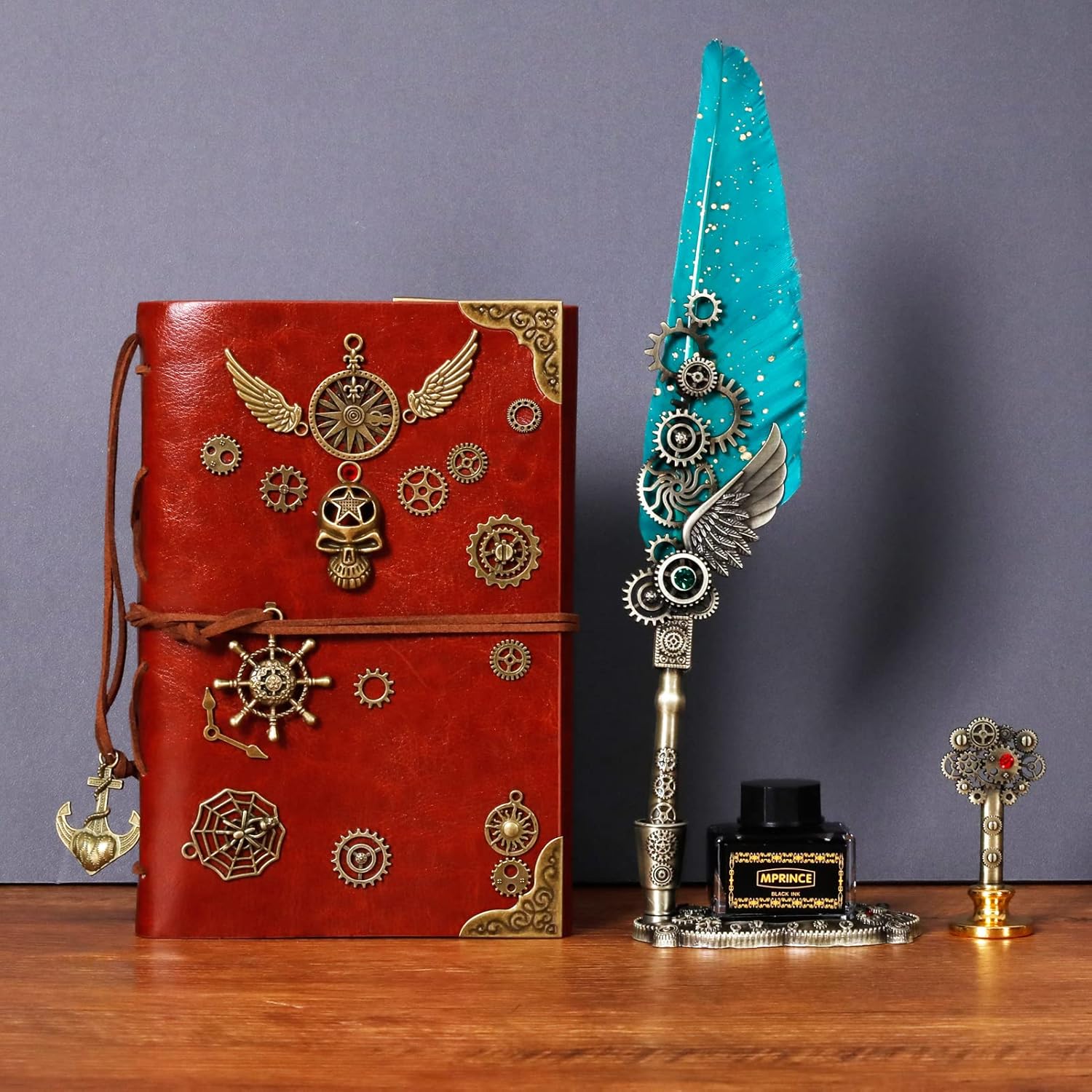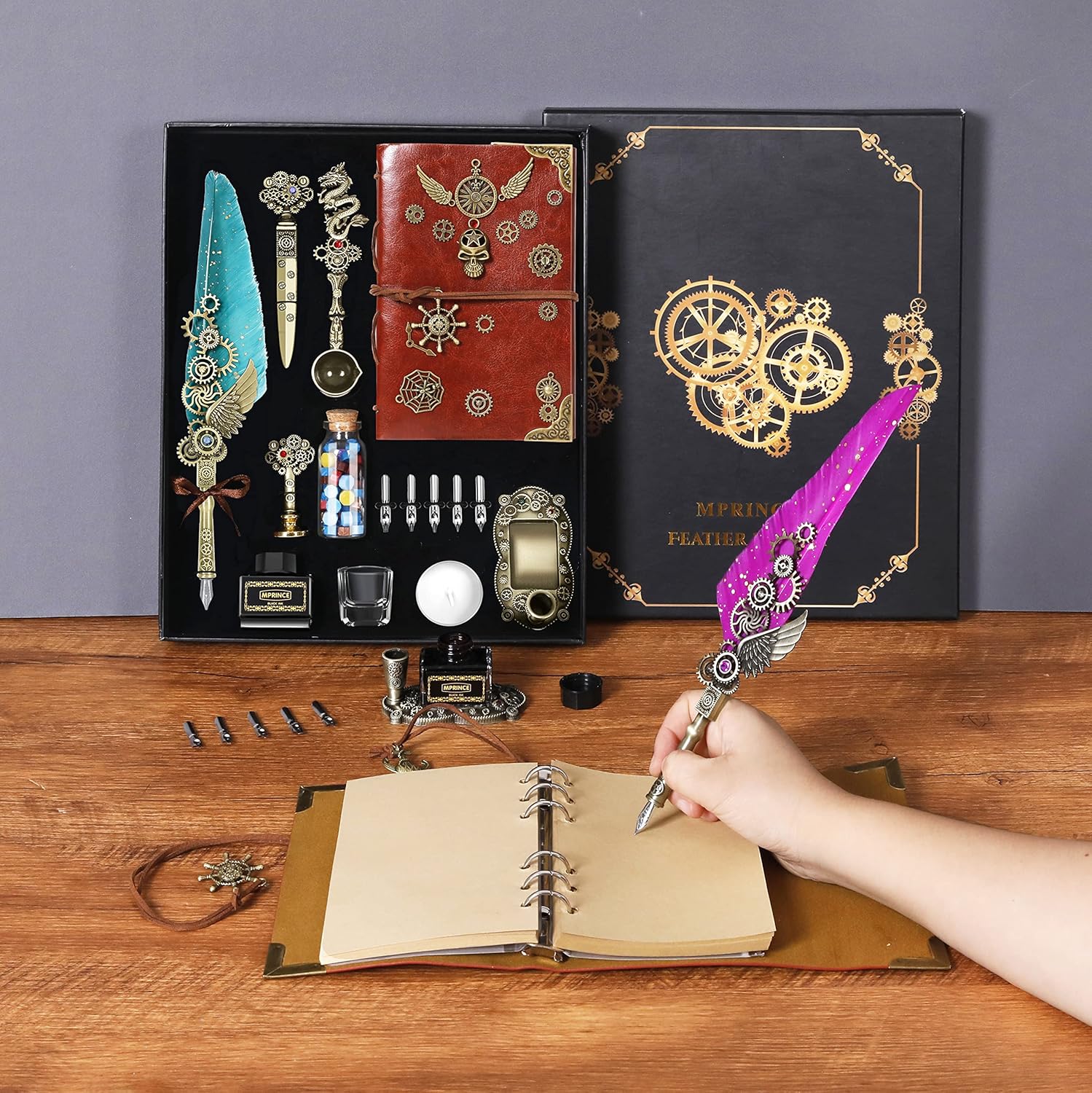 - 【Quill Pen Ink Set Included】: 1* Quill Pen, 1* Notebook, 1* Ink(Black), 1* Seal Stamp, 1* Pen Holder, 5* Stainless Steel Nibs Of Different Sizes, 1* Wax Beads, 1* White Wax, 1* Spoon, 1* Cup, 1*1 Envelope Opening Tool, 1* Envelope and writing paper, 1*Exquisite Gift Box.The unique and beautiful punk mechanical gear design is a beautiful landscape no matter it is placed on the desk, coffee table or computer desk.