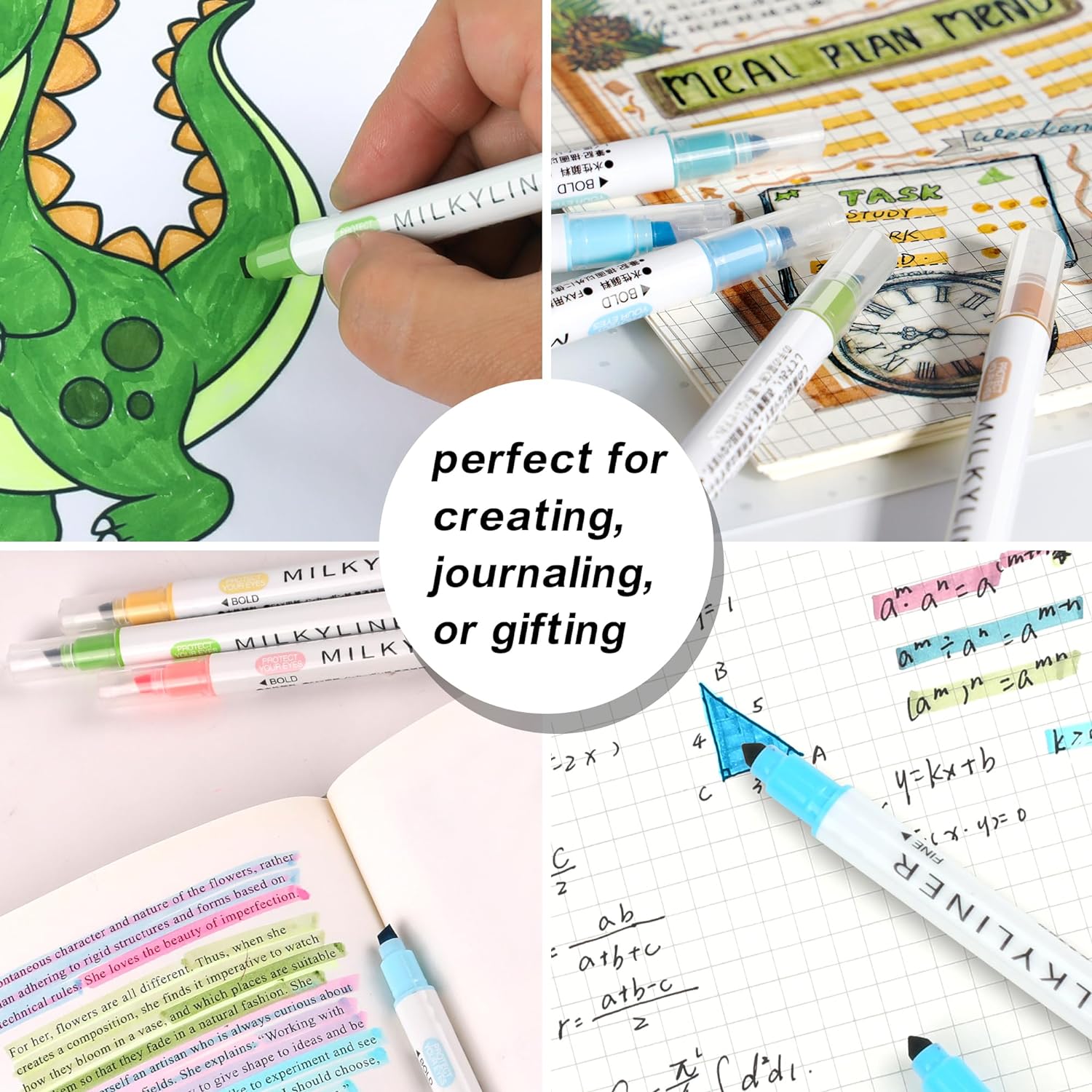 - Dual Tip: One 4.0mm chisel tip for highlighting and one 1.0mm fine tip for underlining. The wear-resistant fiber tips ensure even ink output and smooth writing. Perfectly meeting all your needs for highlighters. It can also be used for drawing, coloring, doodling, note taking and journaling.