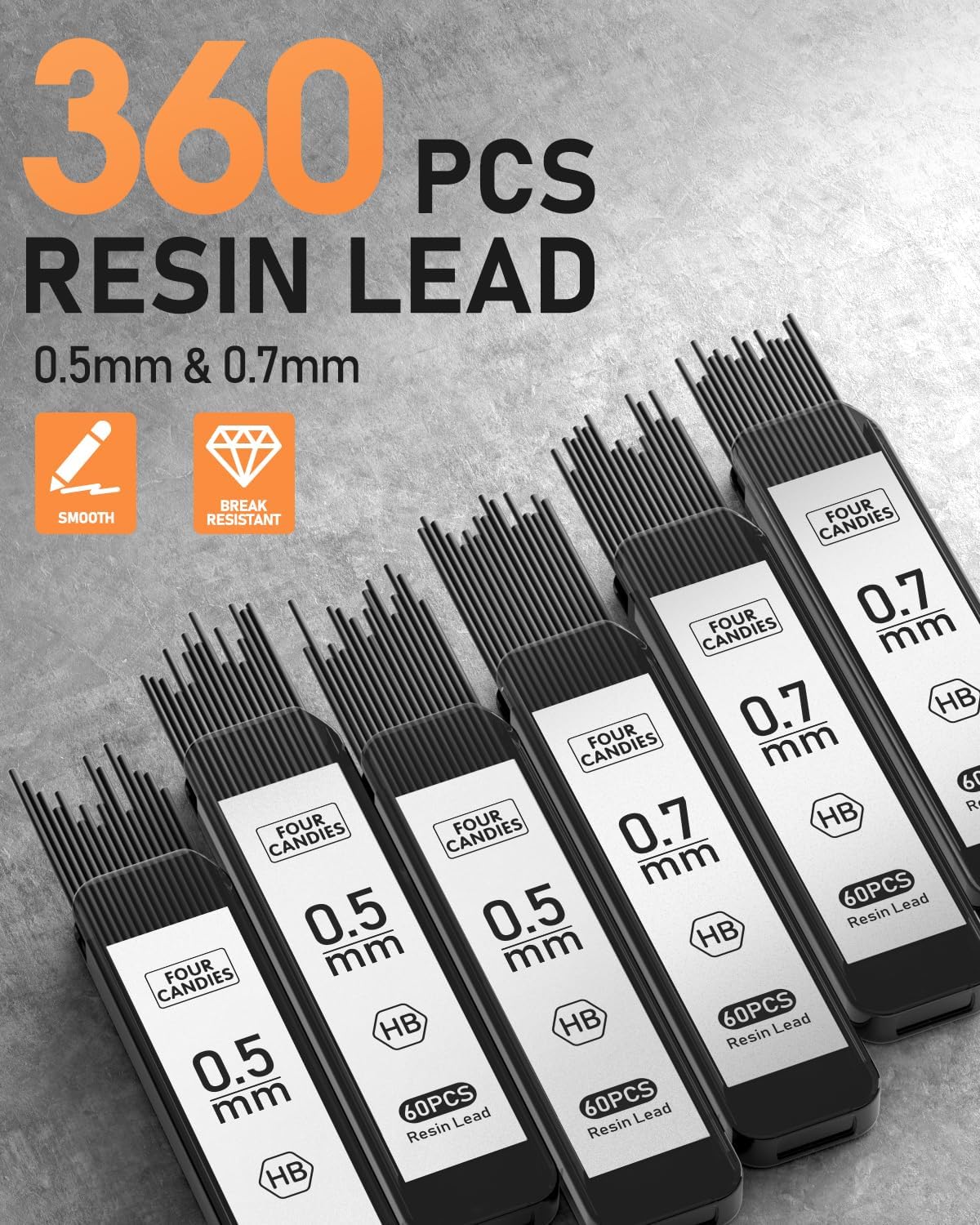 • 【360PCS Resin Lead】6 tubes of 60pcs super capacity leads. A more durable resin lead which doesn’t require sharpening and is not easy to break at the tip or break in the shaft, provides ultra-smooth writing and clear dark lines.