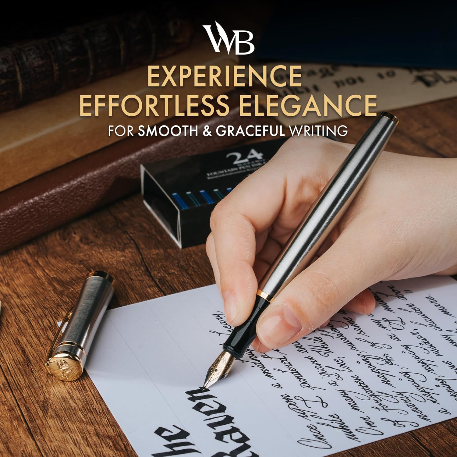 Wordsworth & Black Fountain Pen Set, 18K Gilded Bent Nib, Includes 24 Pack Ink Cartridges, Ink Refill Converter & Gift Box, Gold Finish, Calligraphy, [Silver Gold], Perfect for Men & Women
