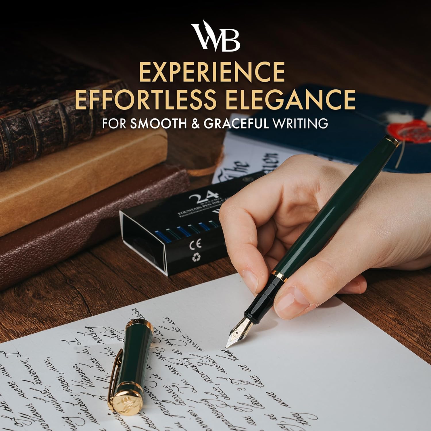 Wordsworth & Black Fountain Pen Set, 18K Gilded Fine Nib, Includes 24 Pack Ink Cartridges, Ink Refill Converter & Gift Box, Gold Finish, Calligraphy, [Racing Green], Perfect for Men & Women