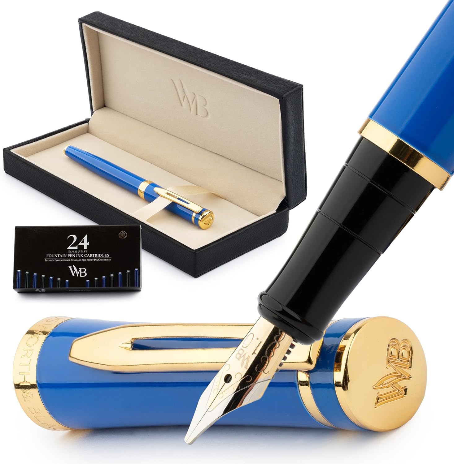 Wordsworth & Black Fountain Pen Set, 18K Gilded Broad Nib, Includes 24 Pack Ink Cartridges, Ink Refill Converter & Gift Box, Gold Finish, Calligraphy, [Imperial Blue], Perfect for Men & Women