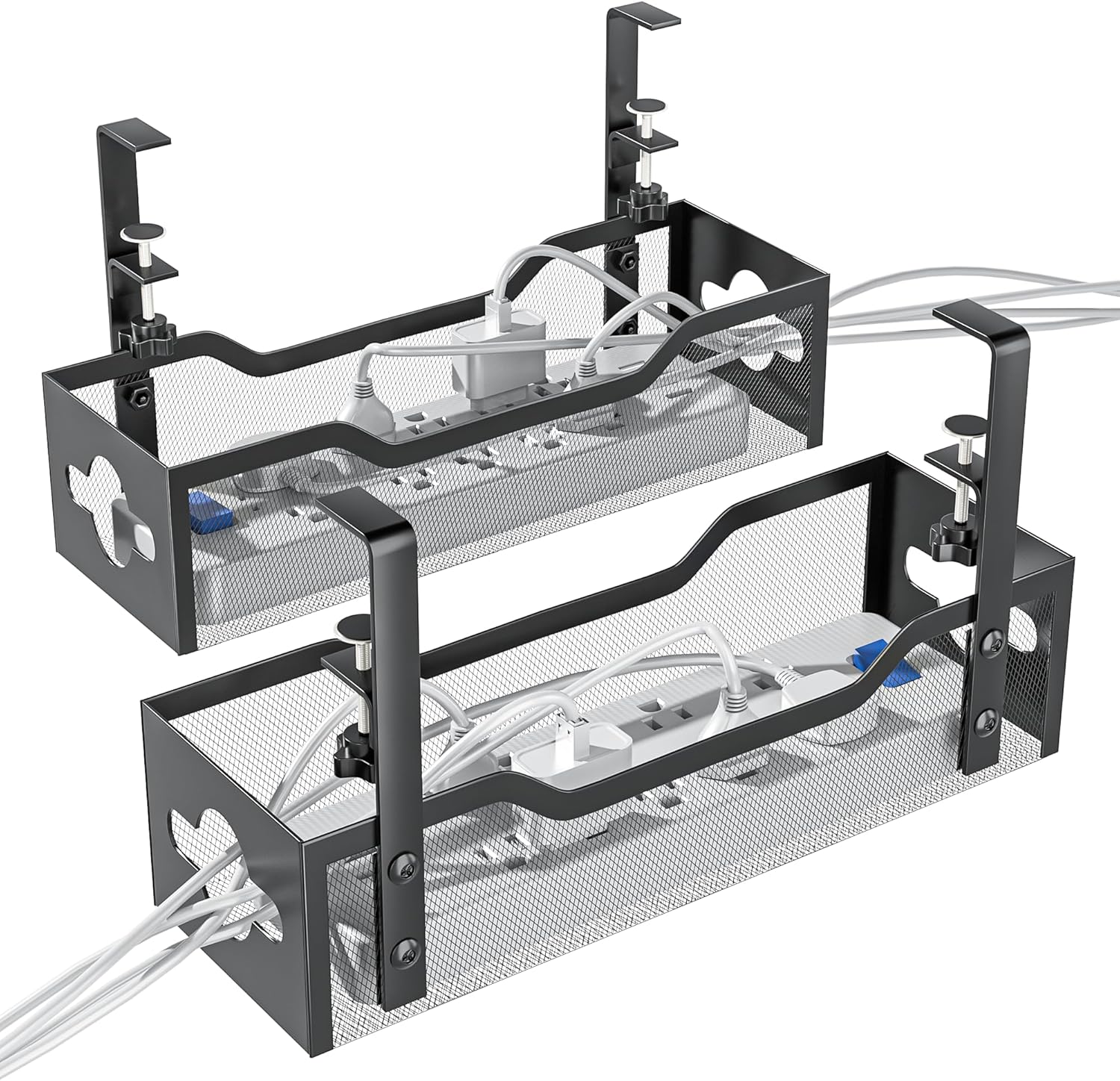 - ELEGANT UNDER DESK CORD ORGANIZER - The design of the mesh cable management frame is more beautiful and generous than that of pure iron wire products, and there is no problem putting small items in it. The design of cable management holes on both sides can help you manage cables more easily.