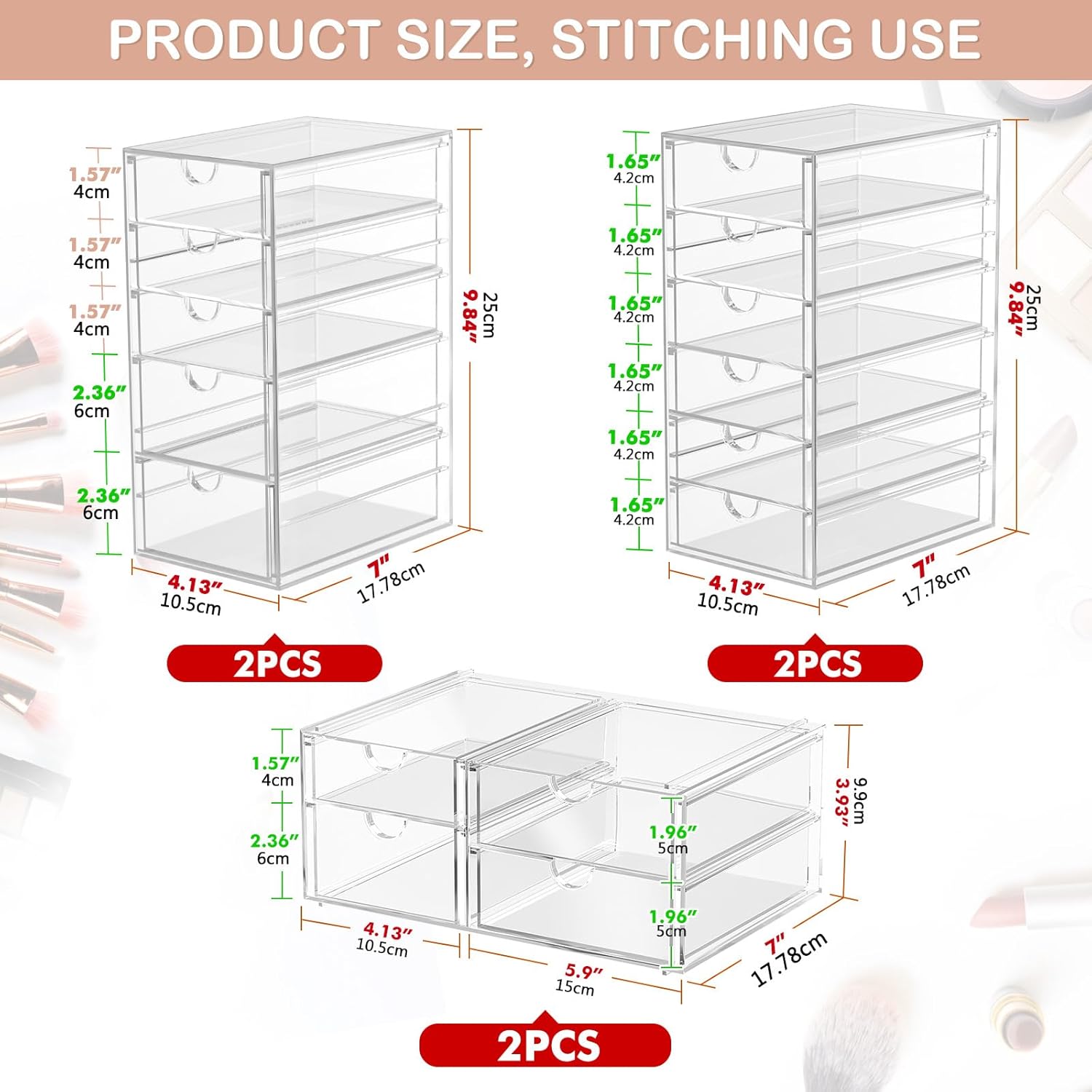 - Clear Display, Store Beautifully - Makeup storage organizer suits lipstick, blushes, foundation, bronzer, mascara, eyeshadow, nail polish- Can also be used to store jewelry, sunglasses, personal accessories, grooming tools, keepsakes. And this drawer organizer can also accommodate all office supply accessories, such as pen, paper clip, pencil, marker, ruler, eraser, scissors, Etc - Fits on most dressers, desk, bathroom vanity desks, and counter tops.