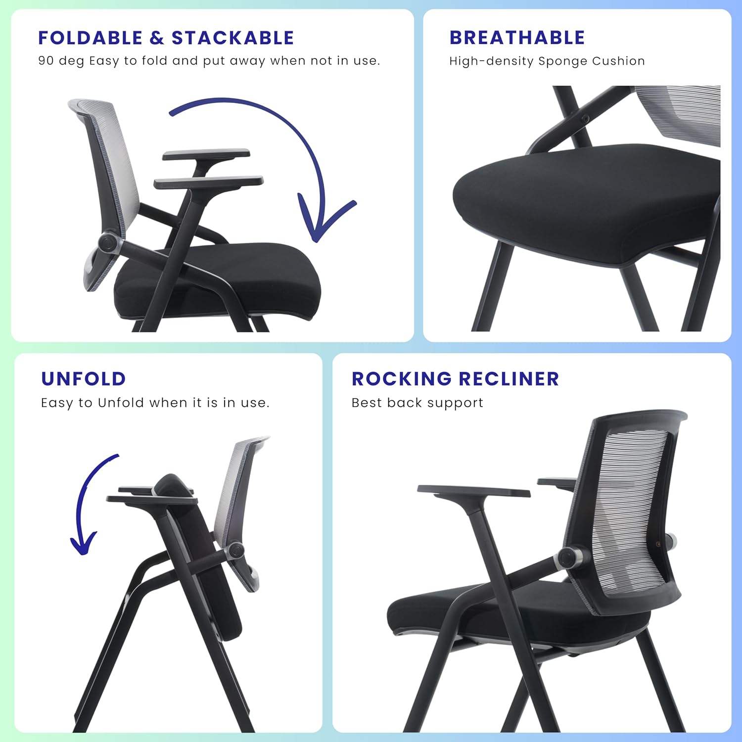 - Foldable and stackable: you will receive 2 pcs conference room chairs with wheels, no need to install, and they can easily be folded and stacked when not in use, great solutions for limited space, ideal for office and temporary events