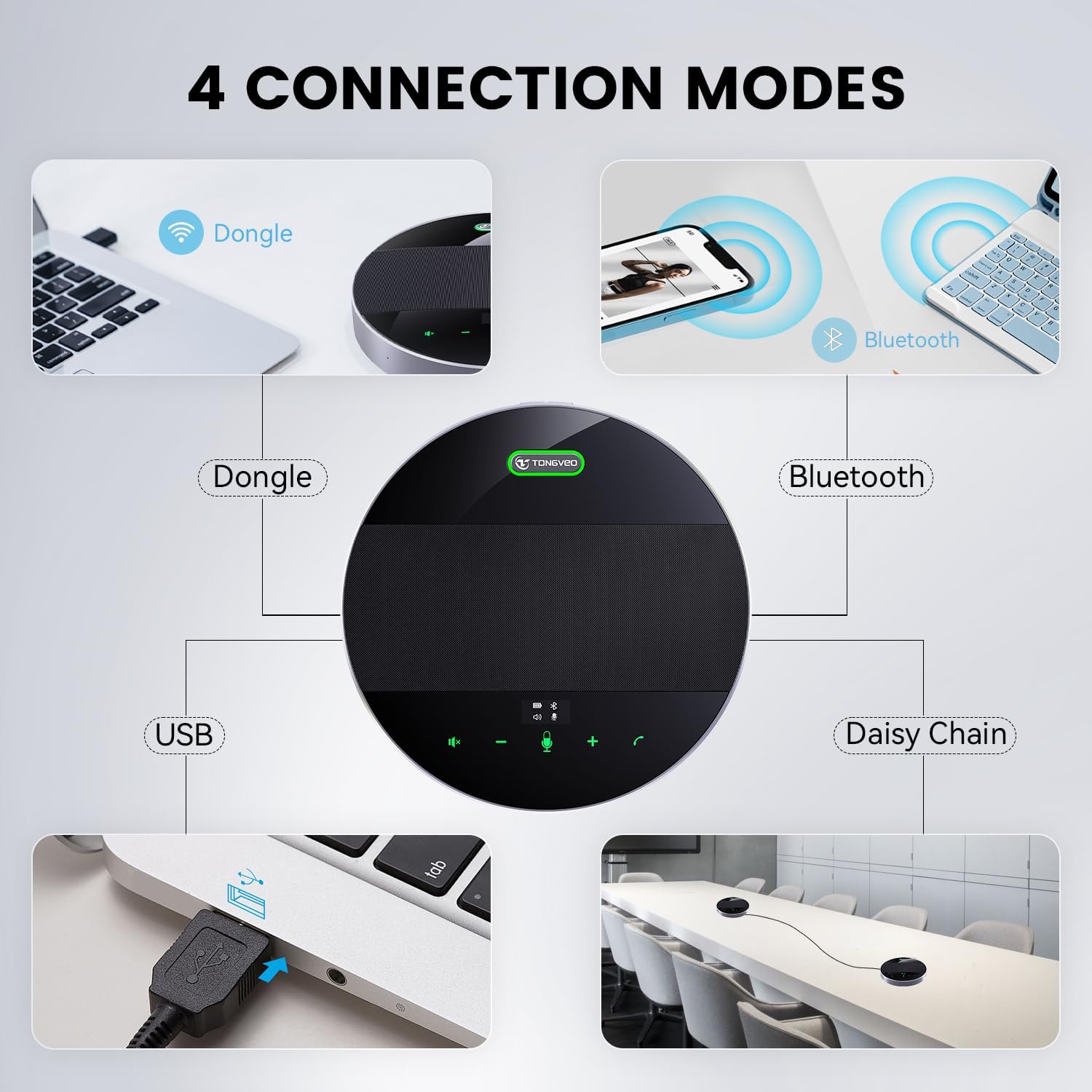- 【Various Connection Methods & Widely Compatibility】The Wireless conference speaker can connect to various Methods, Bluetooth, USB, Wireless Dongle, and 3.5mm Jack audio and Daisy chain 5 methods connection for smartphone,PC, laptop etc. You can connect with the USB cable, Bluetooth pairing directly or go wireless with the included Dongle,No driver needed. works with Windows, Mac OS, IOS,Android, Compatible with mainstream meeting platforms such as Zoom,Teams, WebEx and more
