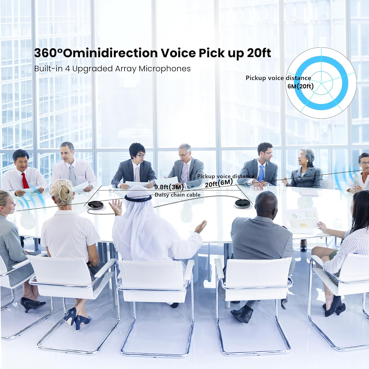 - 【Flexible Daisy Chain for Up to 30 Attendees】This Bluetooth speakerphone with flexible Daisy Chain Feature,allowing cascading 2 conference speakers to expand the effective usage range of hybrid conferences,the Conference microphone supports meetings up to 12-15 attendees, After daisy chain 2 computer speakers to achieve a wider scope of voice pickup 40ft (12M) by using 9.8ft daisy chain cable,enabling up to 30 participants to hear clearer and louder voice in 30-60㎡ large conference rooms