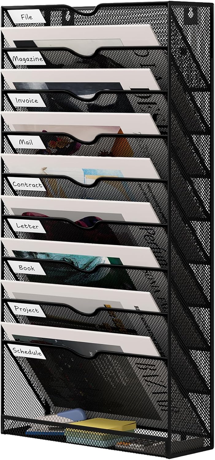 - Durable: The Mail organizer wall mounted is made of durable metal with a coating that extends the life of the wall mount. The metal mesh construction reduces weight while keeping air circulating through the wall paper organizer, so you don't have to worry about mold and mildew on your documents or papers