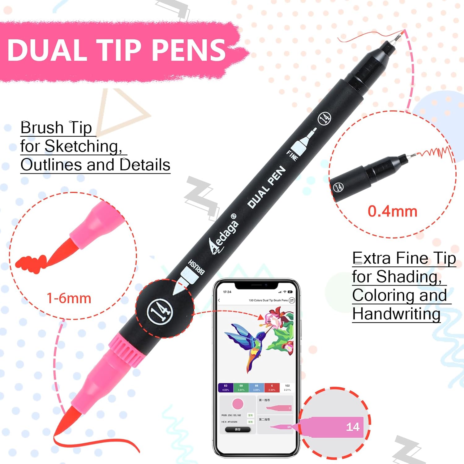 100 Colors Numbered Dual Tip Brush Pens with Free App, Fine and Brush Tips Pens for Adults and Kids, Coloring Markers for Coloring Book Bullet Journaling Note Taking Planner Hand Lettering