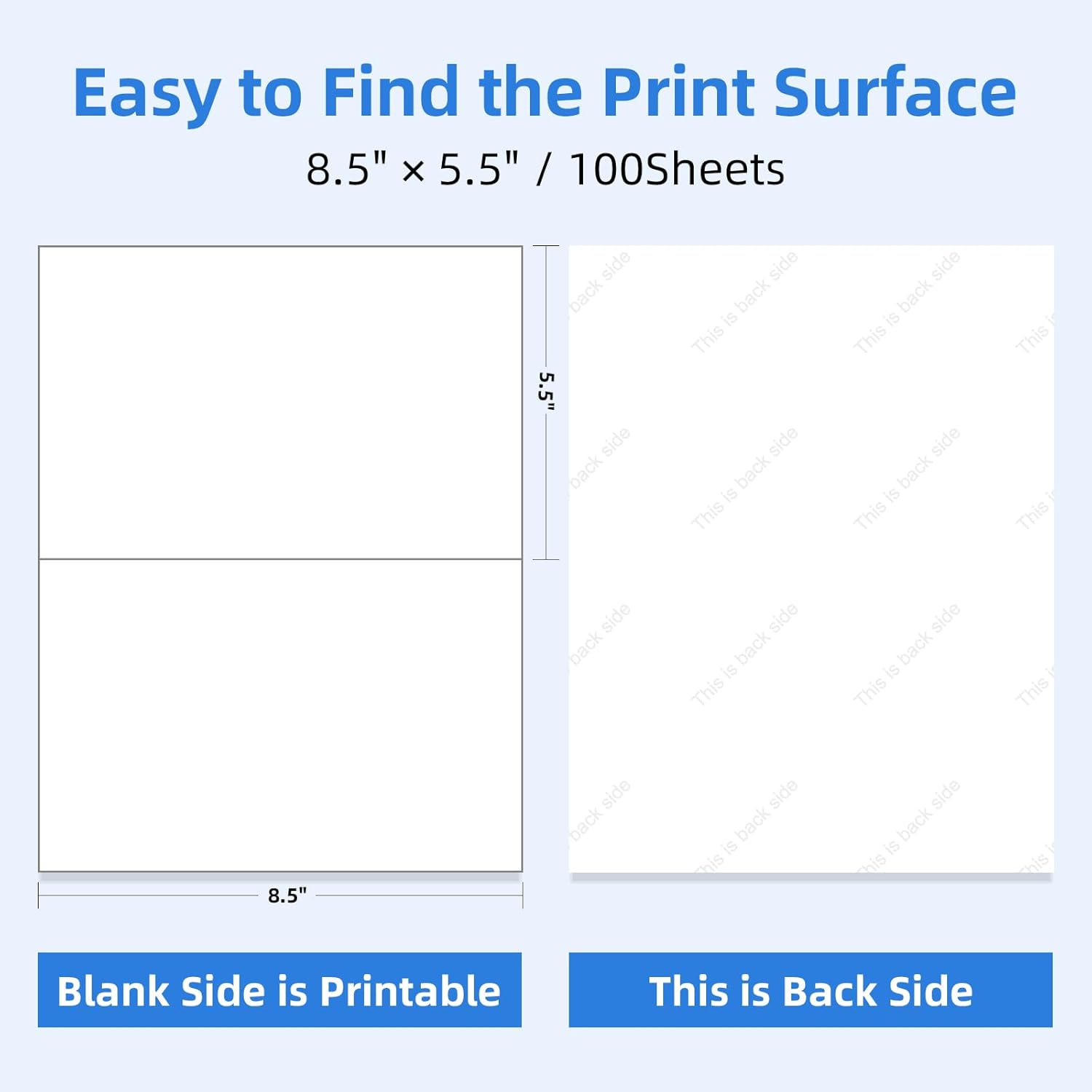 - Labels Size: Sheet Size: 8.5" x 11", Label Size: 8.5" x 5.5". Total 100 Sheets = 200Labels, Color: matte white.