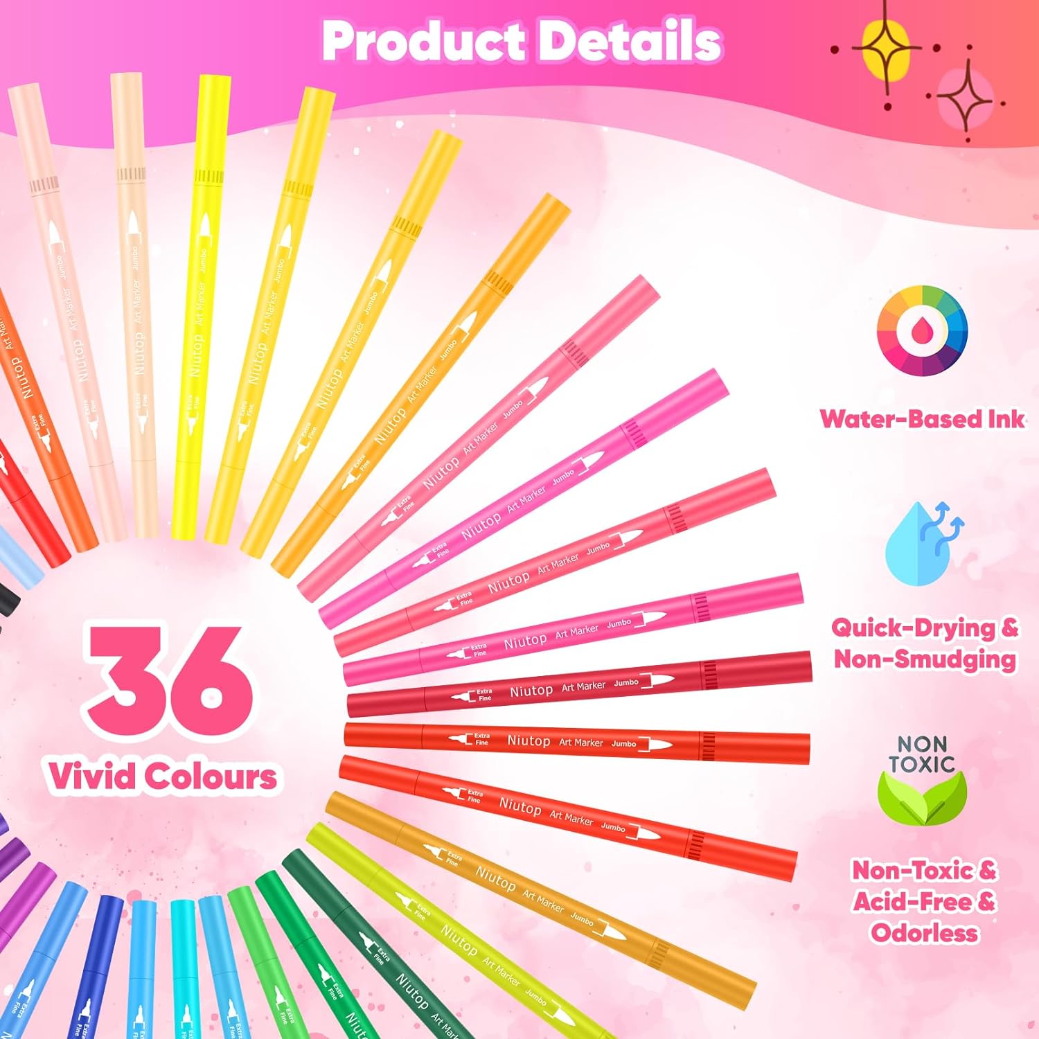 - šØ Dual Tips Marker Pens. Niutop 36 colors Dual-tip brush markers have 2 different tips: 0.4mm fine tip and 1-6mm flexible brush tip. Fine, medium or bold strokes by tilting the brush pens. Fine tip is great for sketch outlining & thin lines and soft brush tip for shading and quickly color in large areas art project.