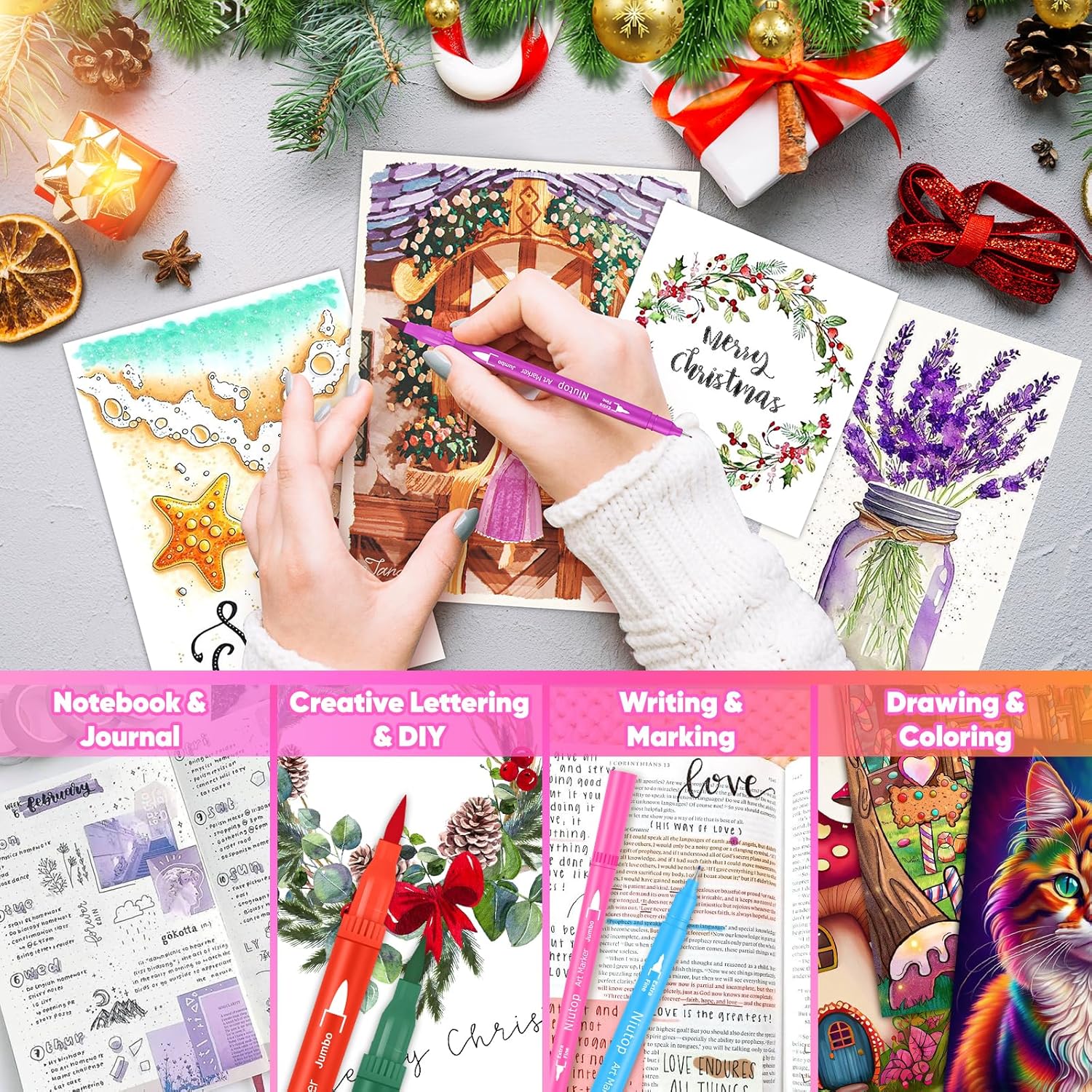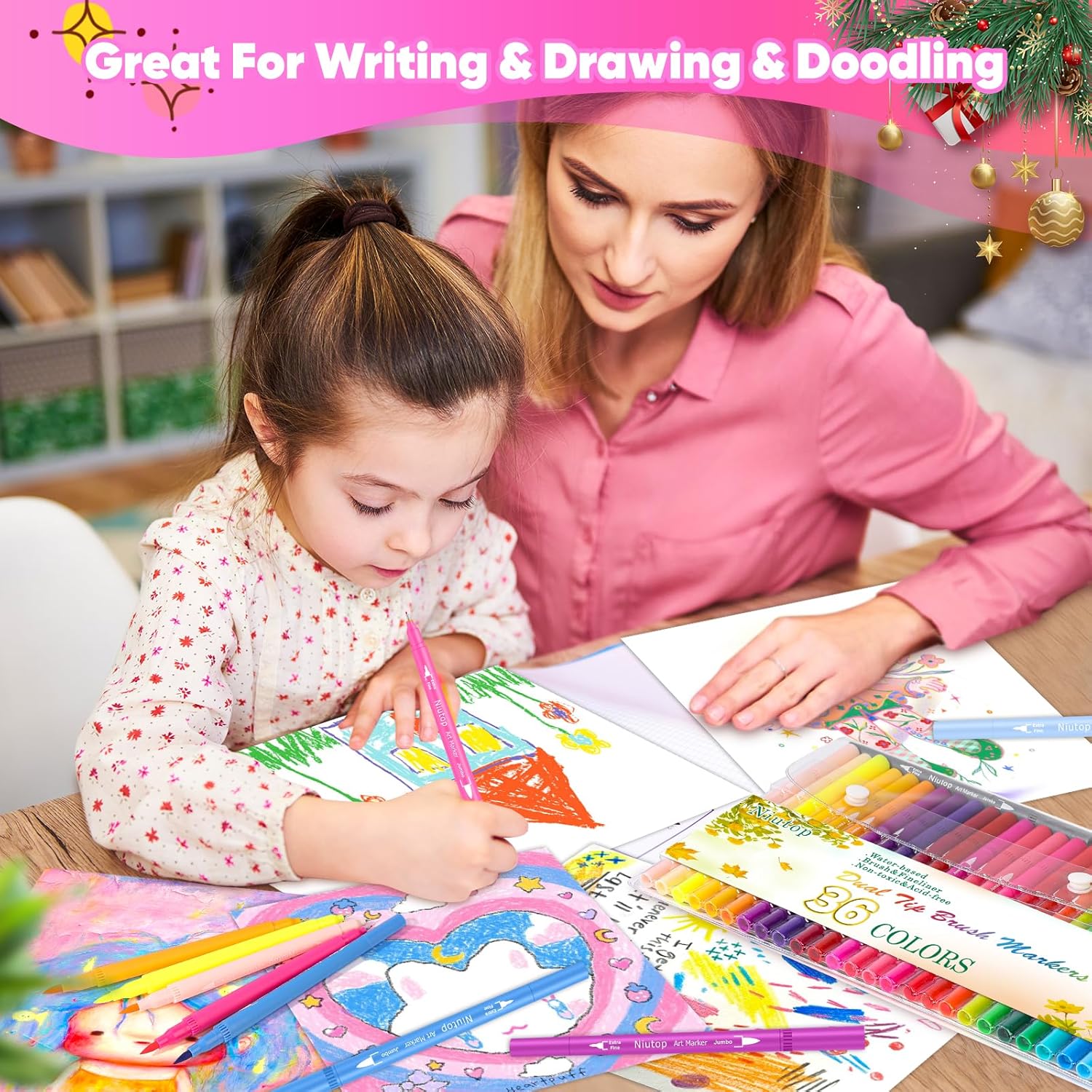 Niutop 36 Colors Fine & Brush Tip Dual Tip Coloring Marker Pens, Doodle Art Markers for Adult Coloring Books, Calligraphy Journaling, Art Supplies for Kids 9-12