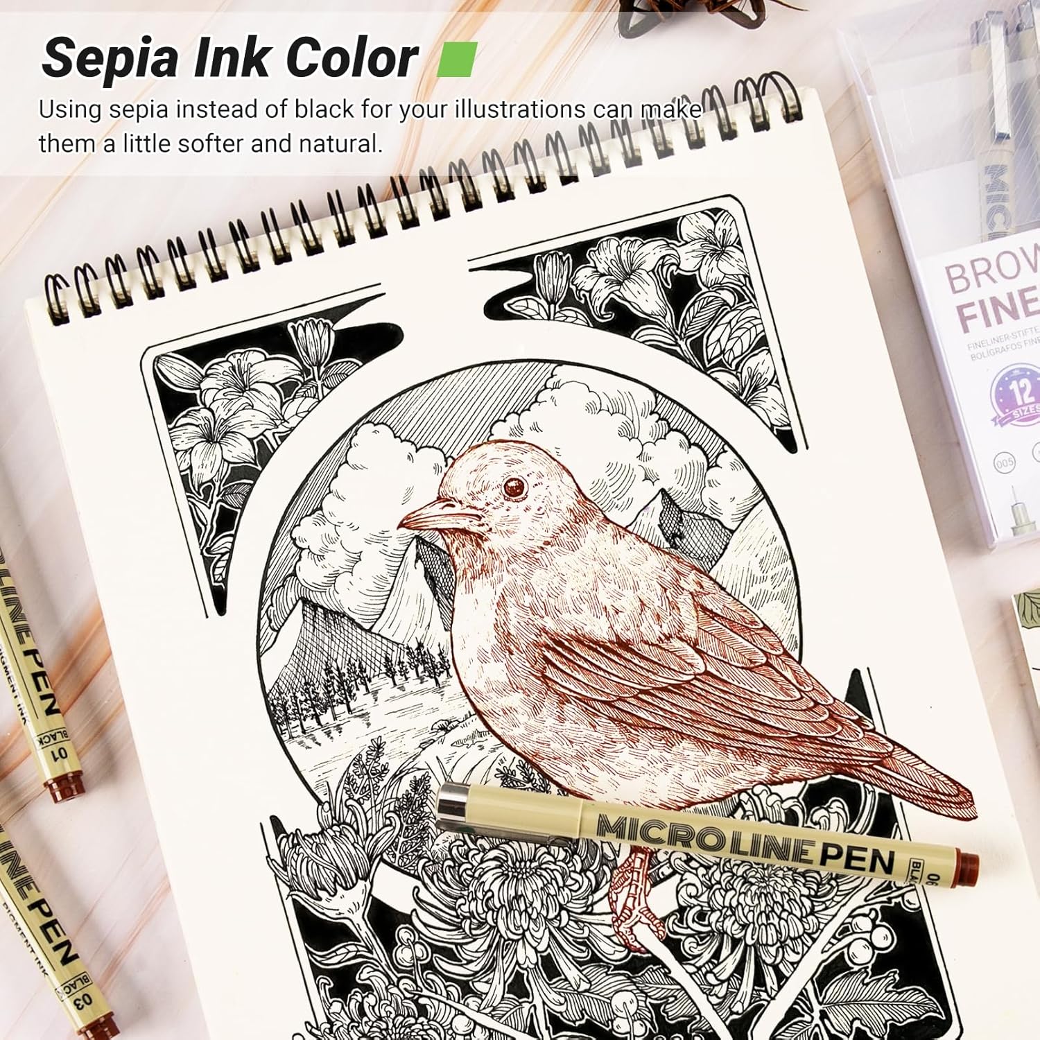 - šØ Unique Sepia Ink: KERIFI sepia micro pens uses highly saturated sepia pigments, unlike the touch provided by black lines, sepia ink makes the lines in the drawing subtle, giving it some elegant vintage flair. Paired with watercolor painting, the drawing is softer and added dimension to drawing. Let's do a variety of bold creative attempts, such as painting some tree trunks, tree houses, autumn scenery, landscapes and portraits.