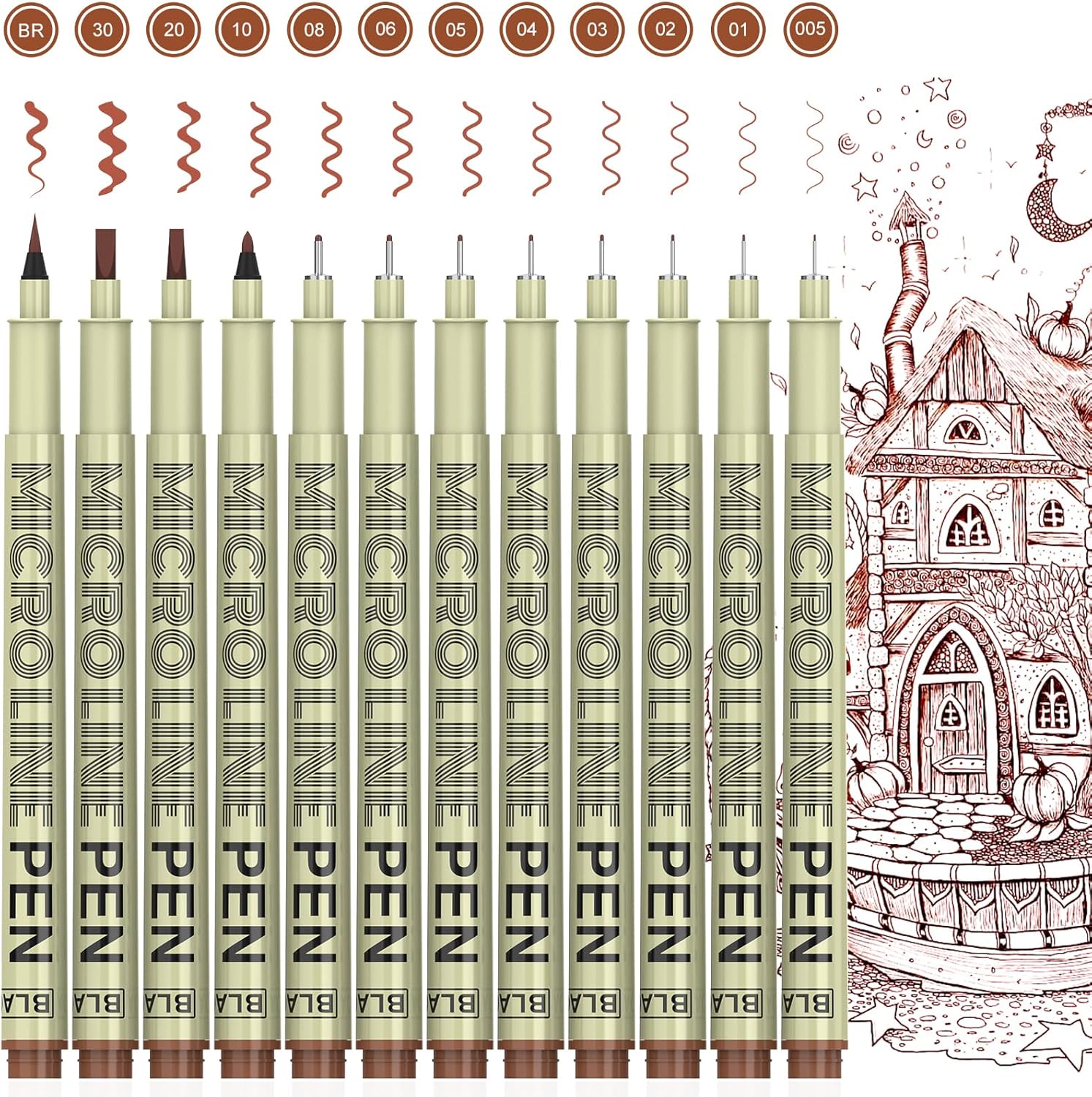 KERIFI Sepia Micro Pen Set, 12 Assorted Sizes Fineliner Ink Art Drawing Pens, Water-Resistant Archival Ink Multiliner Pens for Illustration Technical Sketching Manga Scrapbooking Journaling Zentangle