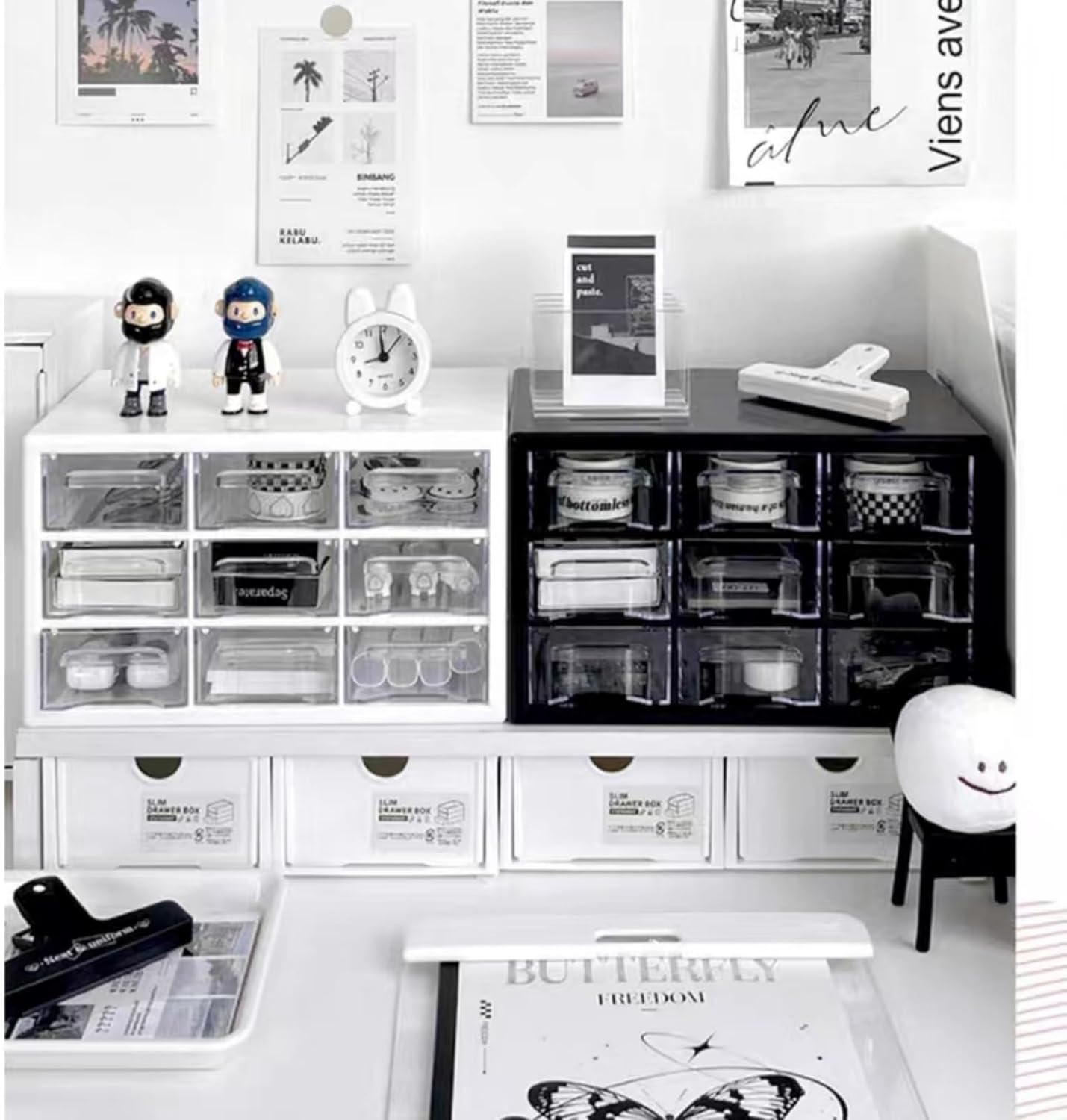 - 【Product Details】Sturdy white plastic with 9 transparent drawers, the drawers can open independently and removable, Plastic organizer box is can be mounted on wall