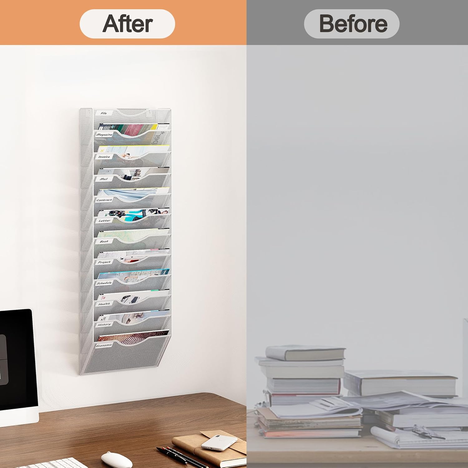 - Durable: The Mail organizer wall mounted is made of durable metal with a coating that extends the life of the wall mount. The metal mesh construction reduces weight while keeping air circulating through the wall paper organizer, so you don't have to worry about mold and mildew on your documents or papers