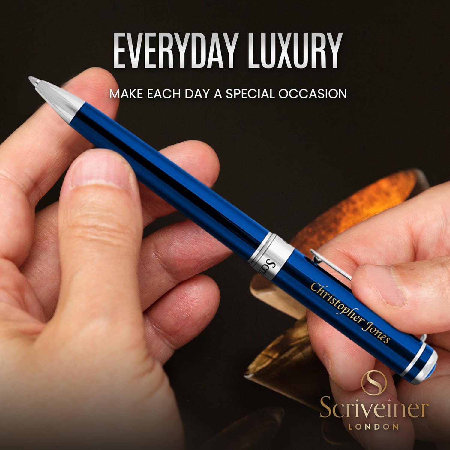 Scriveiner Personalized Midnight Blue Pen - Stunning Blue Lacquer Luxury Pen, Chrome Finish, Schmidt Ink Refill, Best Engraved Ball Point Gift Set for Men & Women, Custom Name Engraving