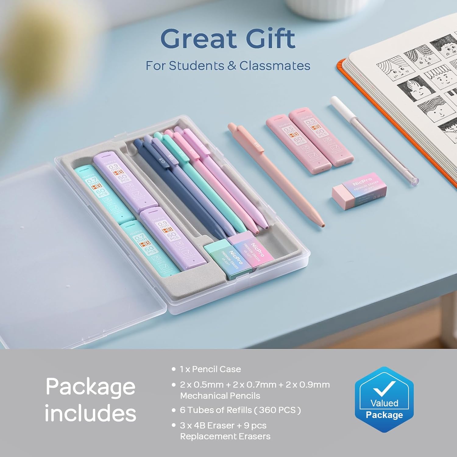 Nicpro 6PCS Pastel Mechanical Pencil Set with Case, Cute Drafting Pencils 0.5 mm & 0.7 mm & 0.9 mm with 6 Tubes HB Lead Refills, Erasers, Eraser Refills, Aesthetic School Supplies for Girls Writing