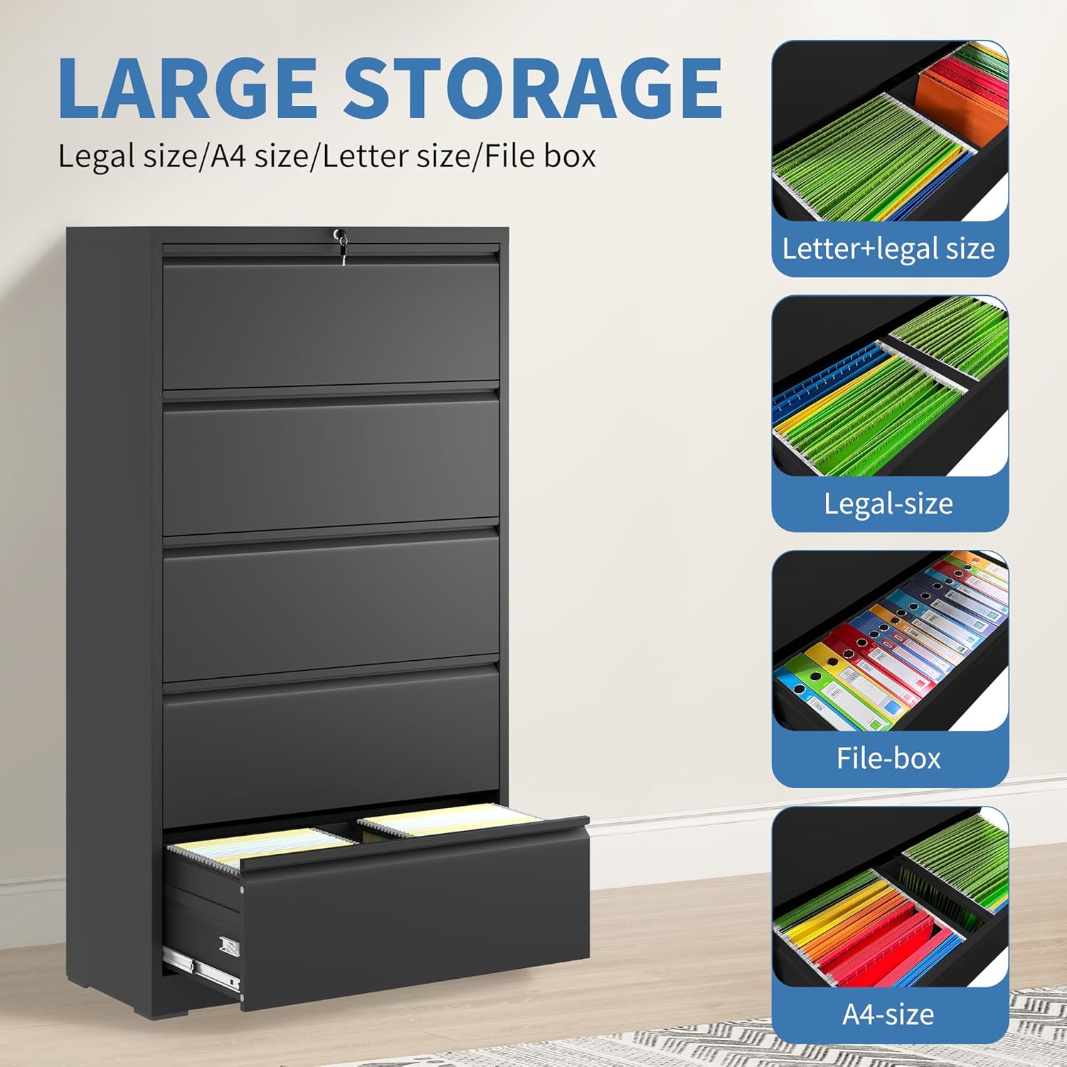 File Cabinets 5 Drawer,Metal Office Storage Filing Cabinet with Lock,Black Lateral Filing Cabinet for Home Office,Horizontal Locking File Cabinets for Legal/Letter/A4,Assembly Require,Black